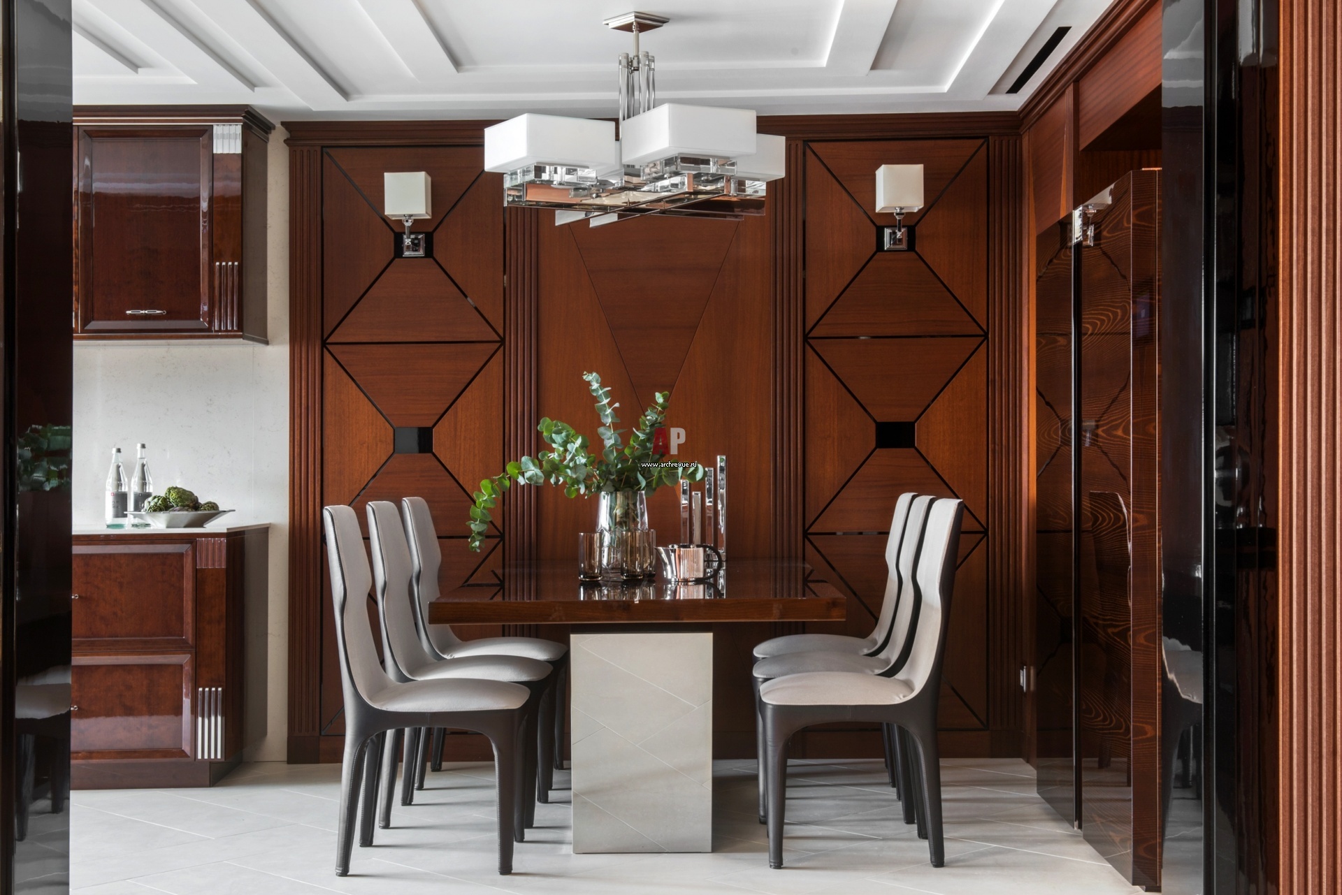 Буазери, двери и кухня выполнены из красного дерева. В спецификации шпон значился mogano (по-итальянски «красное дерево»). Декоративные элементы – МДФ, окрашенный в черный цвет, под толстым слоем глянцевого лака.