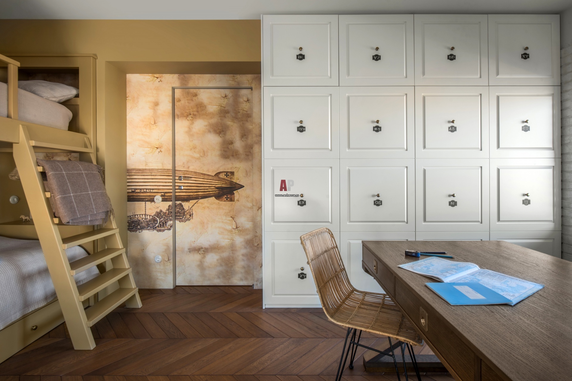 Комната братьев-близнецов. Вдоль окна строит большой письменный стол «для двоих». Шкаф стилизован под старинную картотеку с выдвижными ящиками, которые на деле являются остроумной деталью оформления встроенной системы с функциональными распашными дверцами. Стена и дверь украшены принтом с изображением дирижабля.