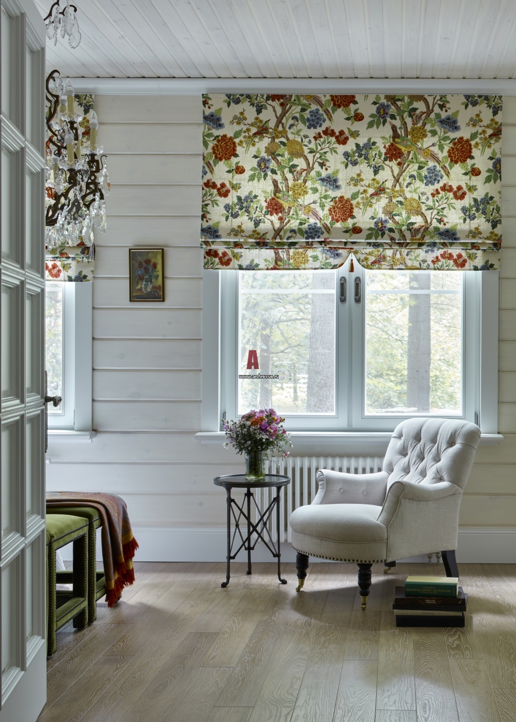 Гостевая спальня в светлом деревянном доме. Кресло и металлический столик, Eichholtz.