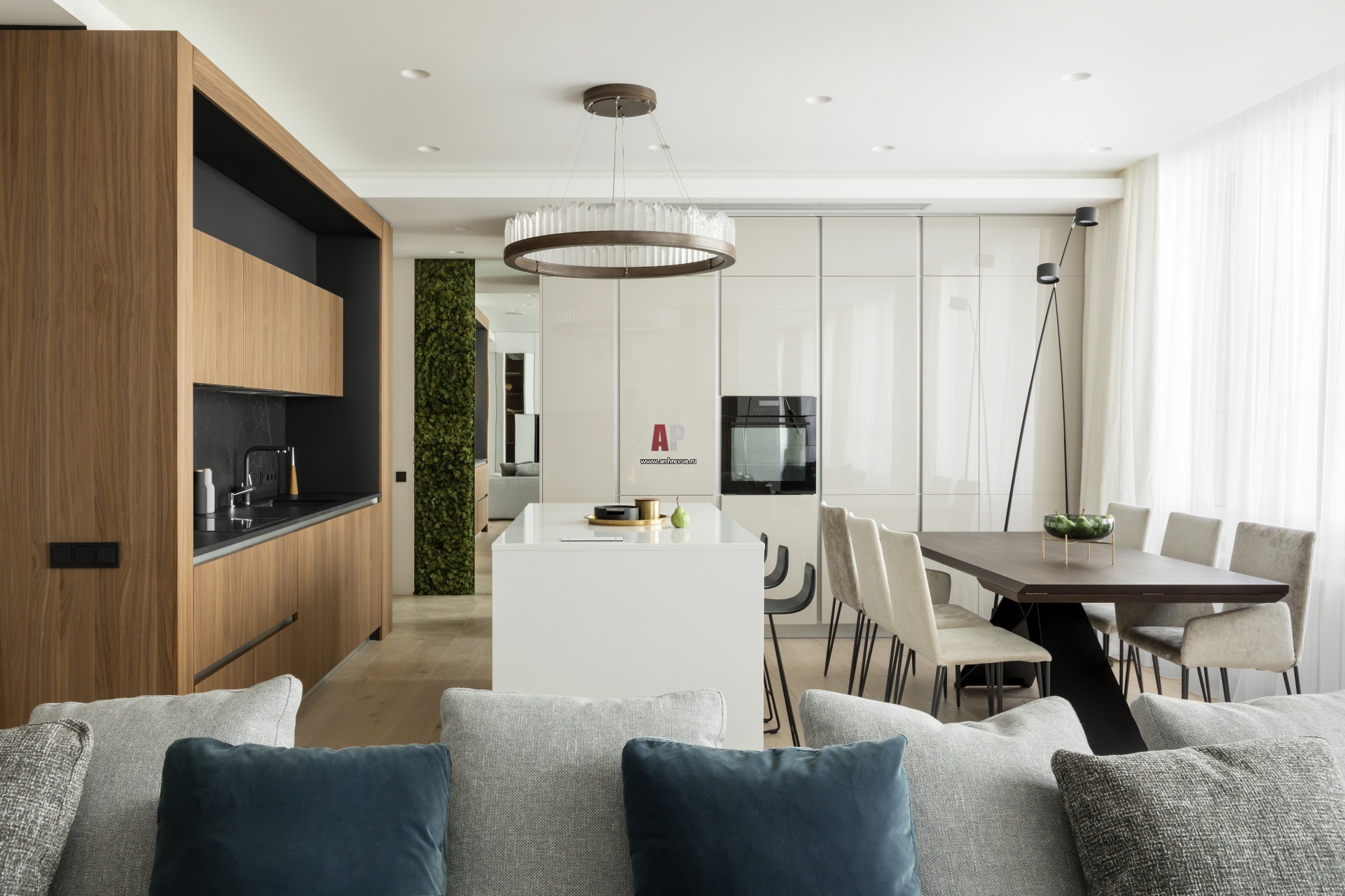 Преимущества опен спейс в удобных маршрутах, в том числе и круговых. Кухня, Cesar. Люстра, Fine Art Lamps.