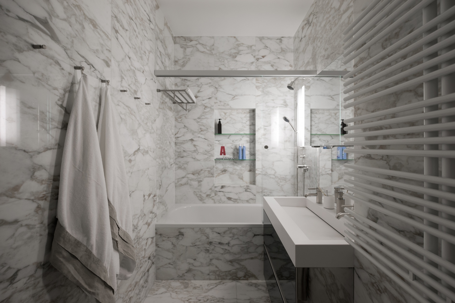 Интерьер ванной выполнен в современном стиле. Стены, пол, фасад ванны облицованы белым с серыми прожилками мрамором Calacatta (Paonazzetto). Сантехника, Dornbracht.
