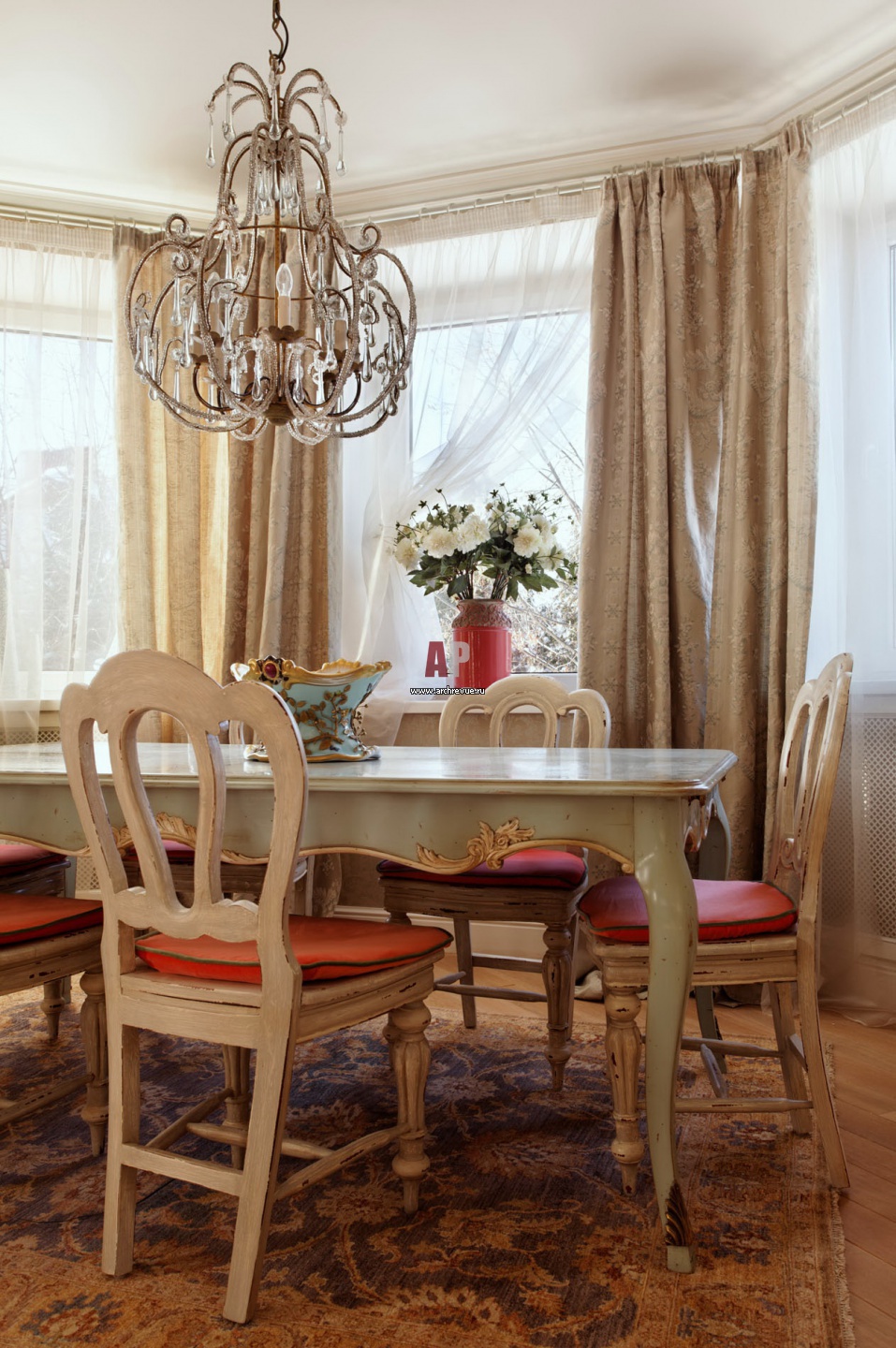 Центр композиции столовой – нежно-голубой обеденный стол с эффектом состаренной поверхности.