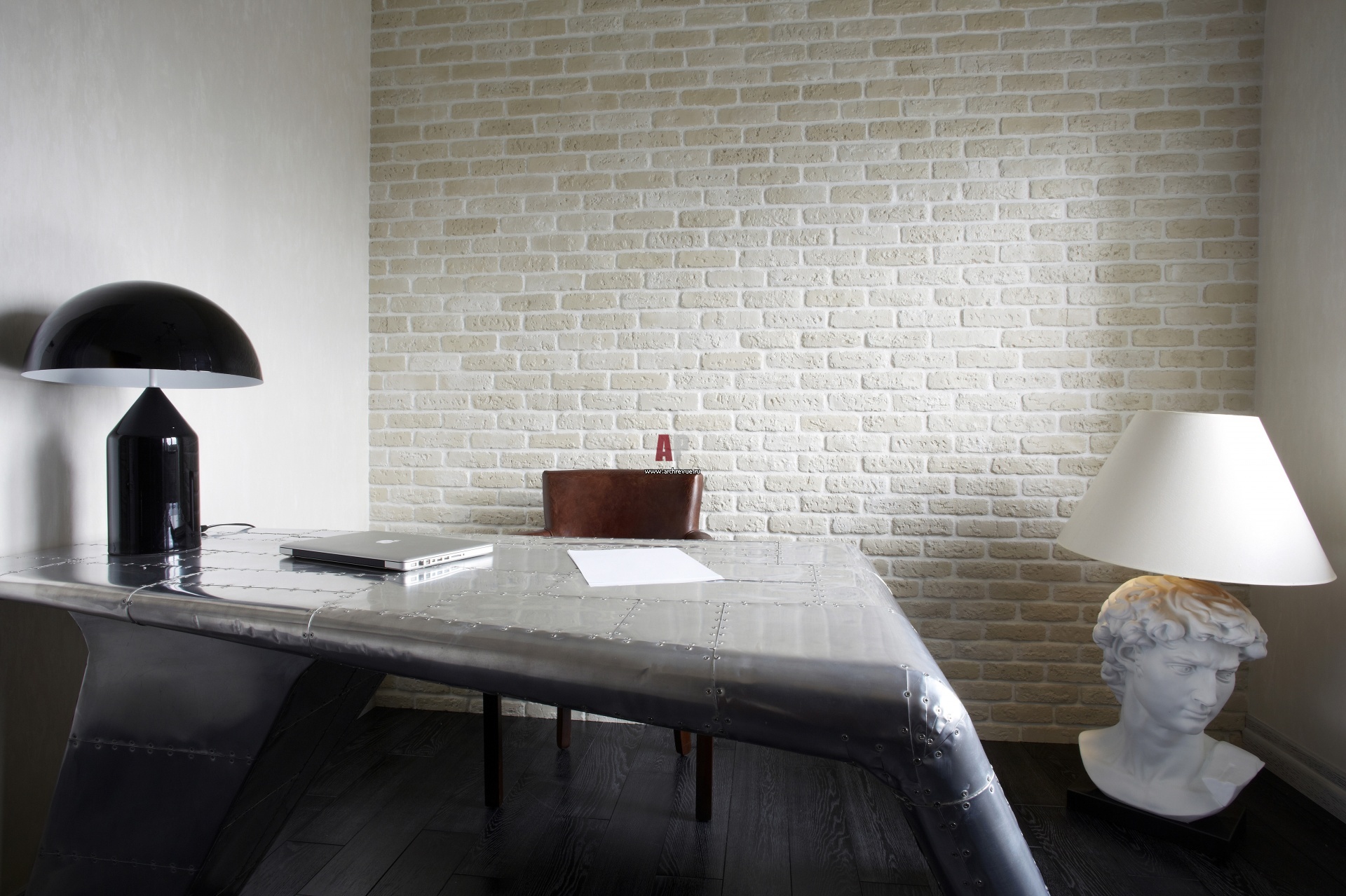 Интерьер кабинета меблирован мебелью из металла: стеллаж, письменный стол в стиле Авиатор в виде крыла самолета.