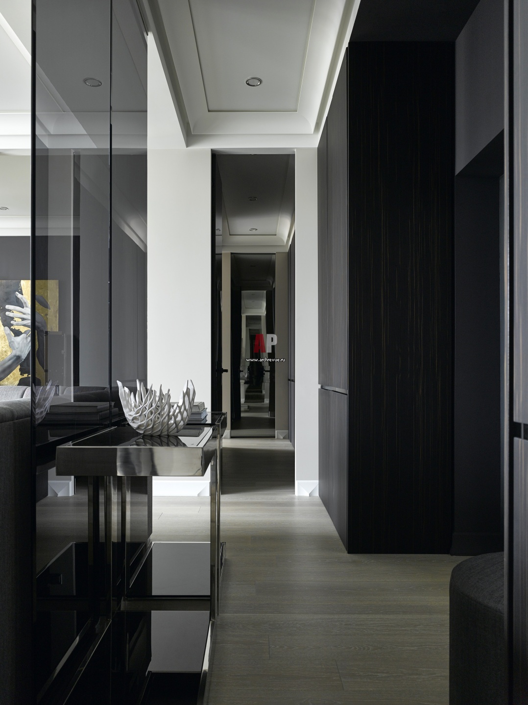 Монохромная квартира в стиле минимализм. Стеклянные двери объединяют прихожую и внутренний холл, ведущий к приватным помещениям.