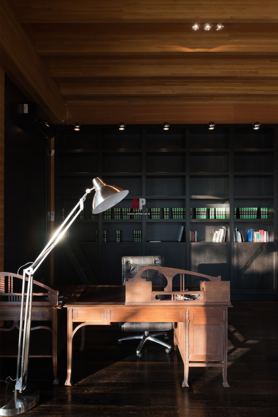 Интерьер библиотеки. Библиотечный шкаф выполнен на заказ из дуба, мореного «под венге». Потолочные балки, сосна.