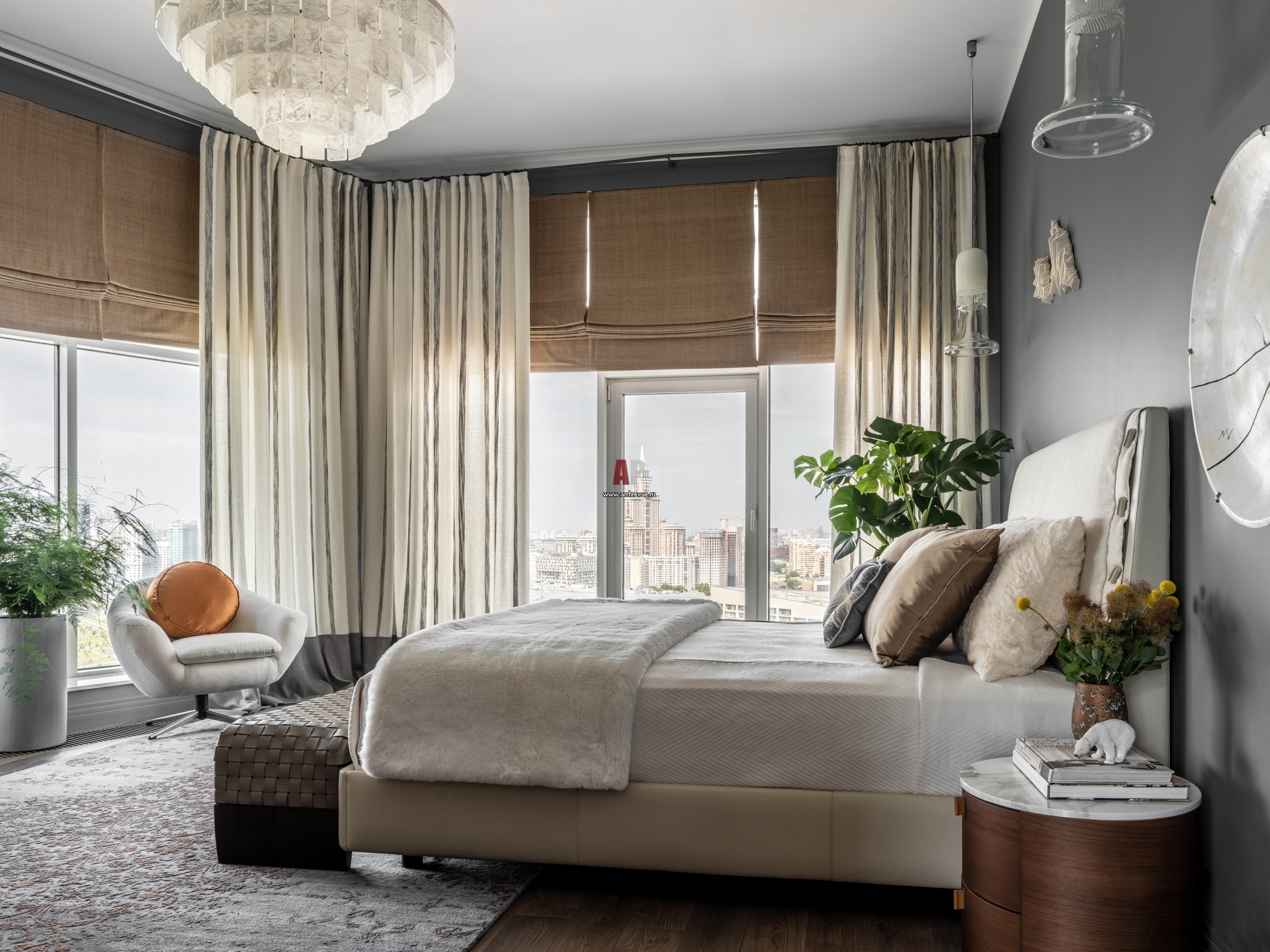Хозяйская спальня расположена на втором этаже. Изначально во всех помещениях здесь были потолки более 5 метров. Но дизайнер их уменьшила их до 3,45 м, а пол подняла на 60 см – на один уровень с террасой. Благодаря чему появились панорамные окна.