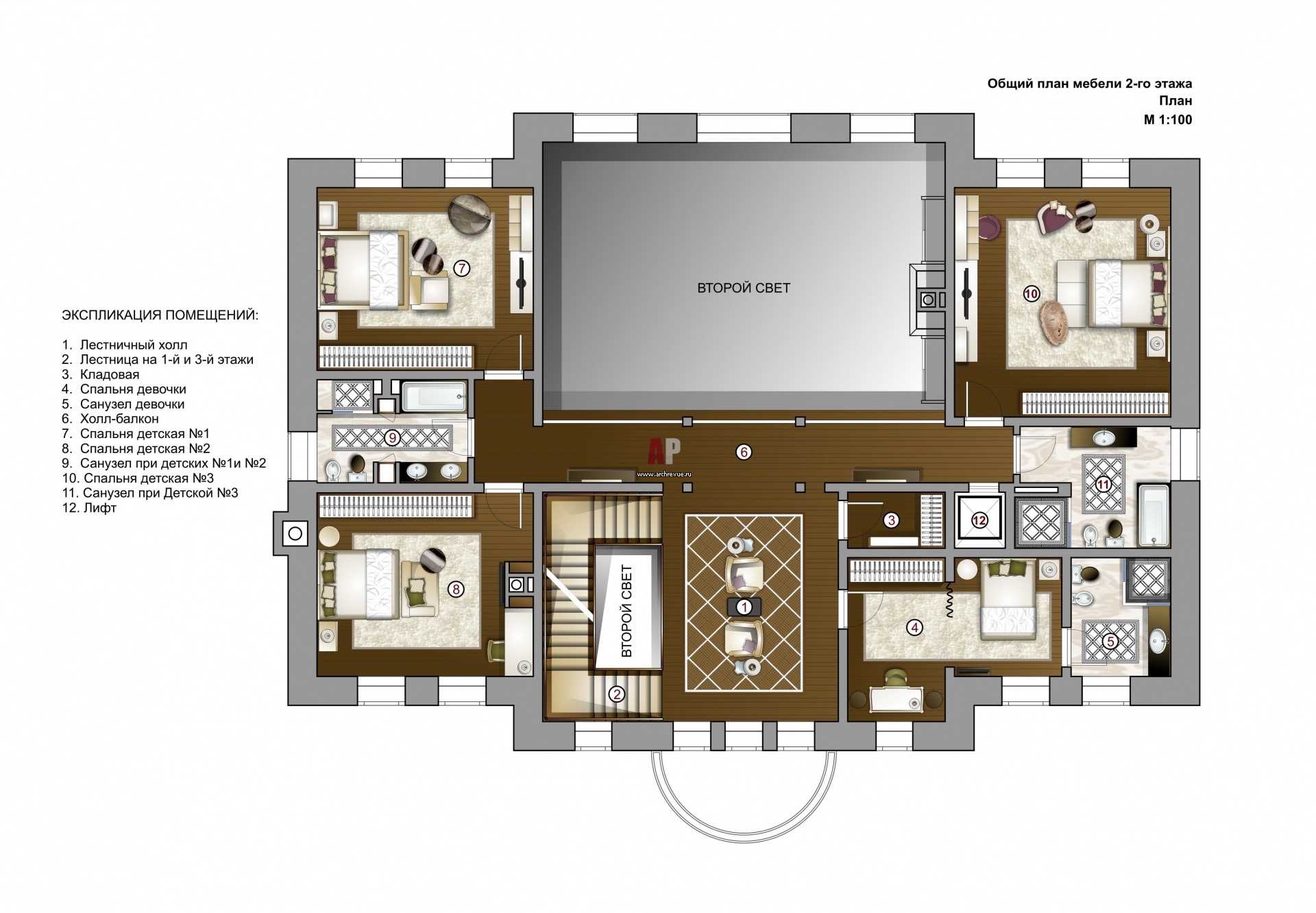 Планировка 2 этажа 4-х этажной семейной резиденции. Общая площадь – 2000 кв. м.