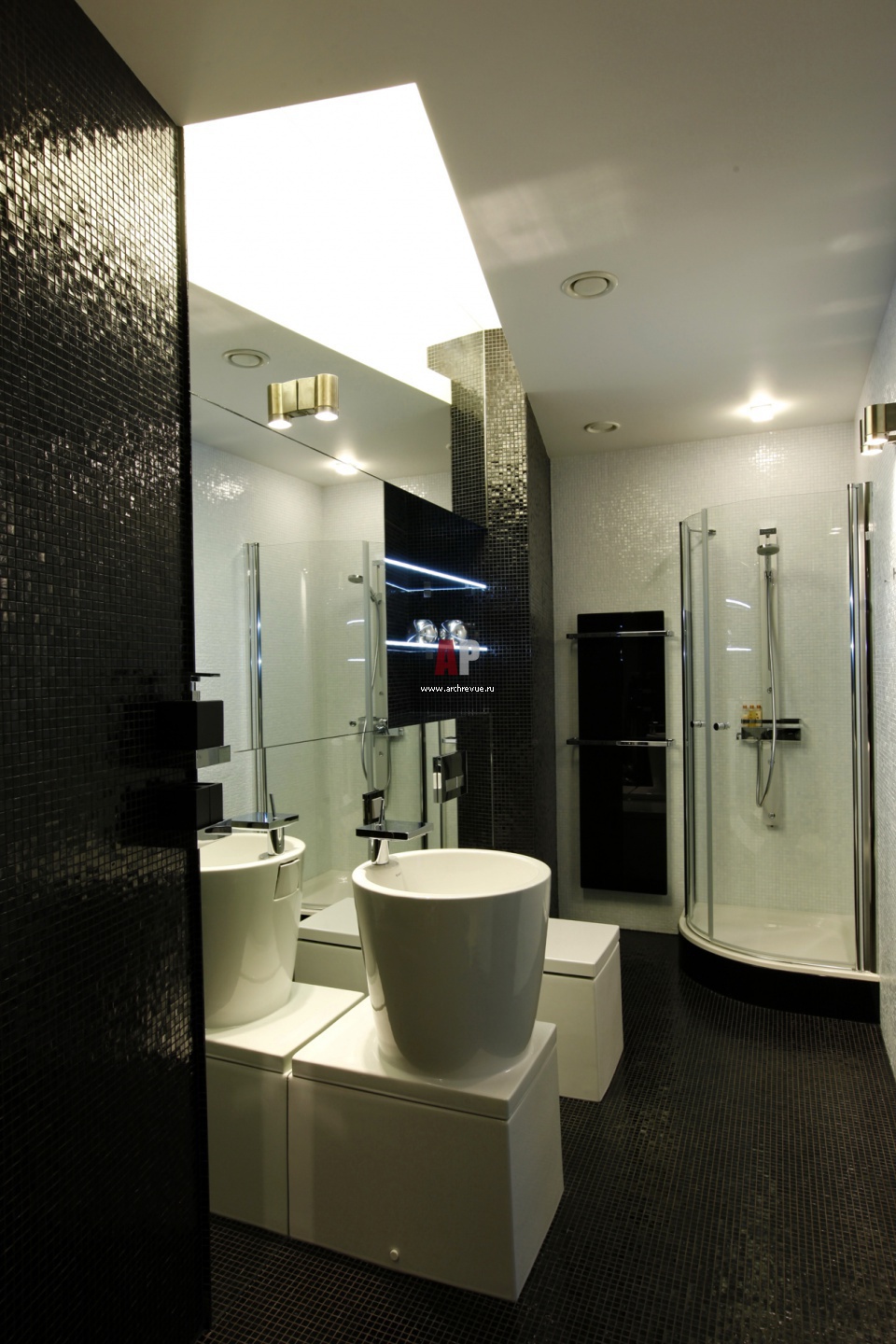 Фото интерьера гостевого санузла в стиле минимализм. Сантехника Duravit, душевая кабина Hueppe.