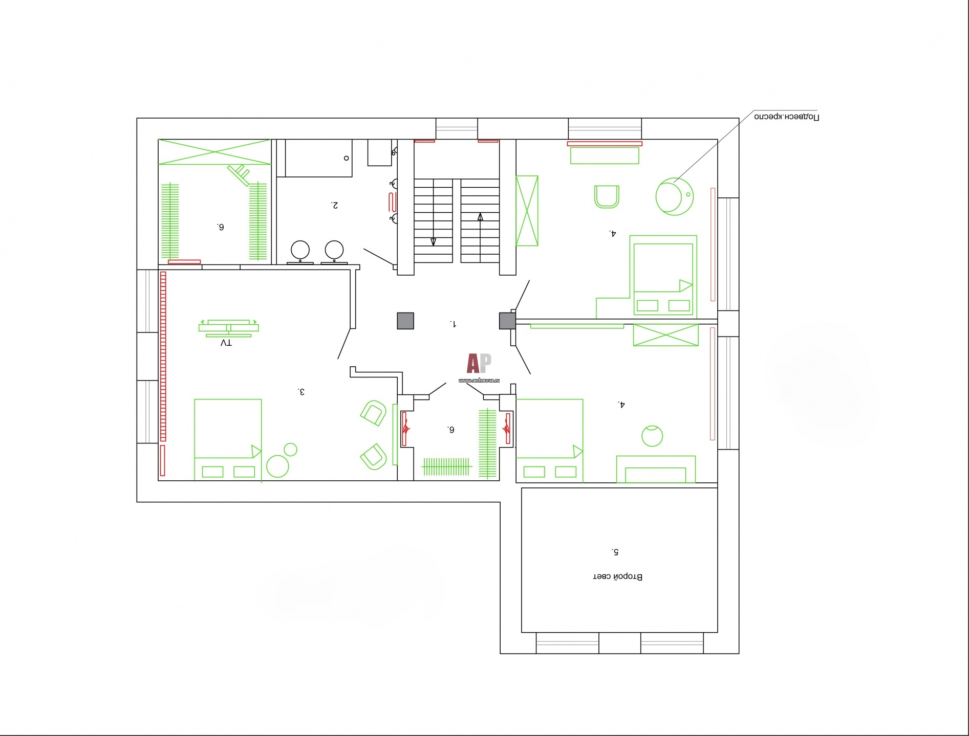 План второго этажа двухэтажного дома, построенного по индивидуальному проекту. Общая площадь: 350 кв. м.