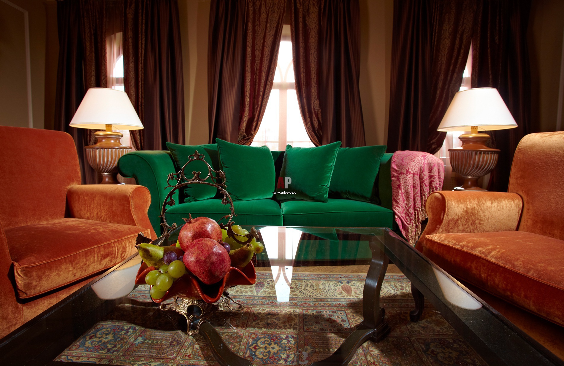 Зона отдыха в президентском номере. Интерьер номеров этого уровня решен в стиле неоклассика с легким намеком на французские традиции декора интерьеров.