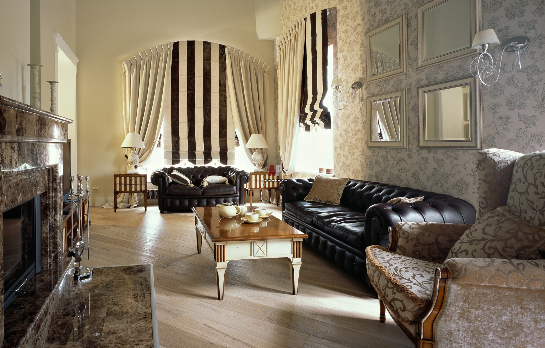 Стилистику оформления гостиной задали два одинаковых комода, выкрашенных в светлую и темную полоску. В поддержку к ним появились полосатые римские шторы на полукруглых окнах.