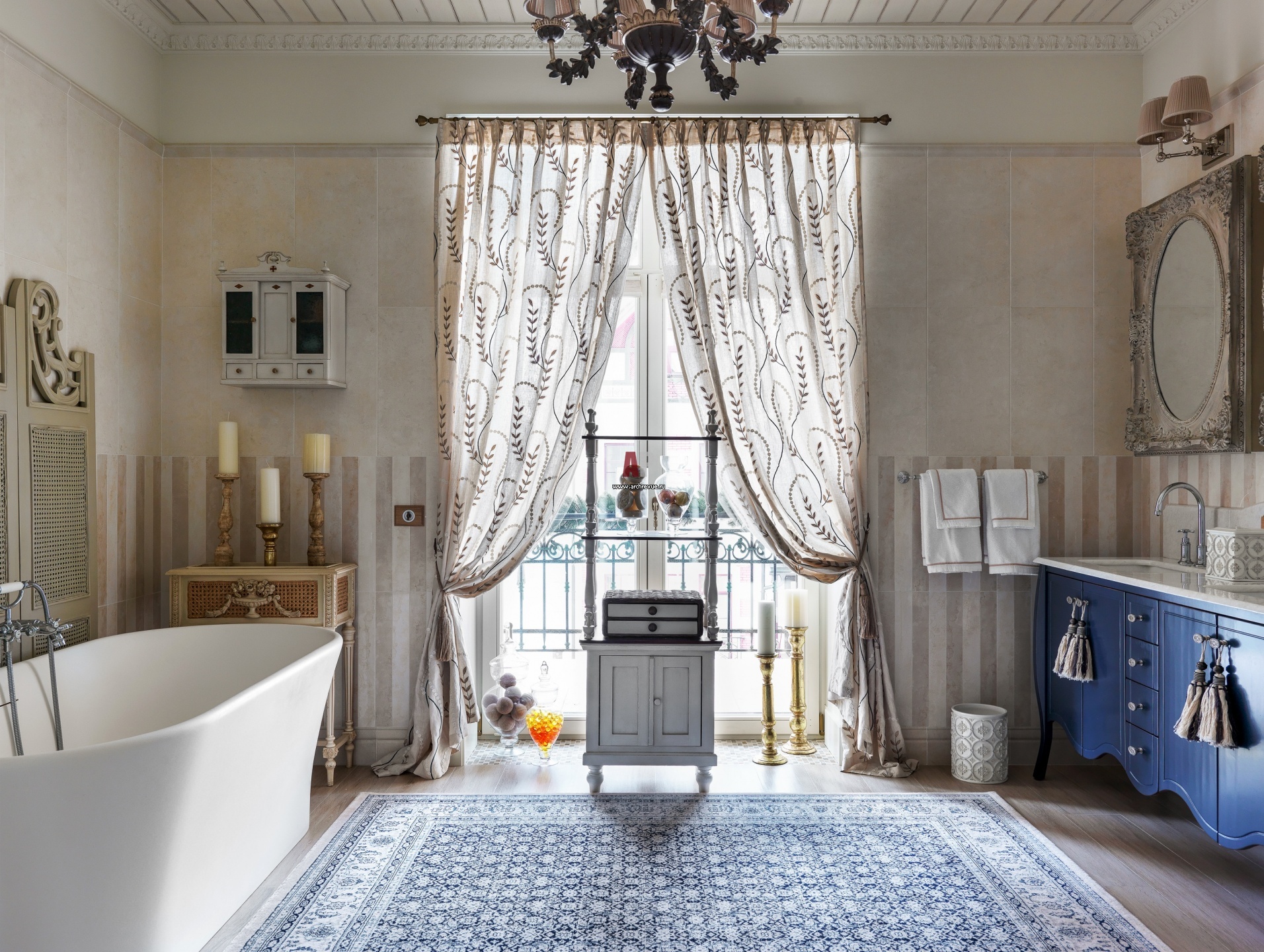 Ванная комната при хозяйской спальне выдержана в духе французской классики с элементами стиля Прованс. Дизайнеры перекрасили мебели и сохранили сантехнику и напольное покрытие.