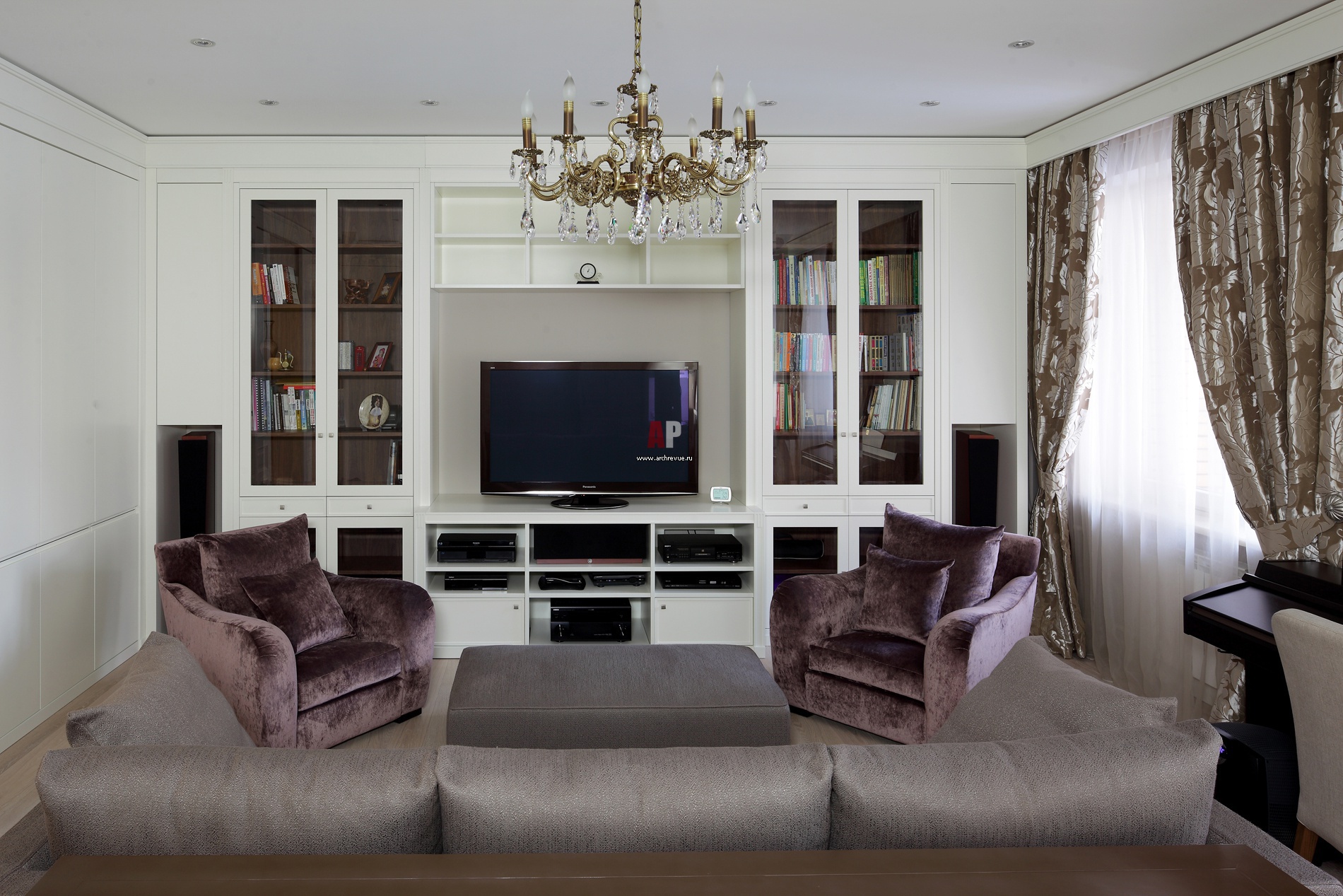 ТВ-панель в гостиной встроена в сложную мебельную композицию. Системы хранения спроектированы как под стеклом, так и за панелями. Панели и встроенные элементы из дерева выкрашены в молочно-белый цвет.