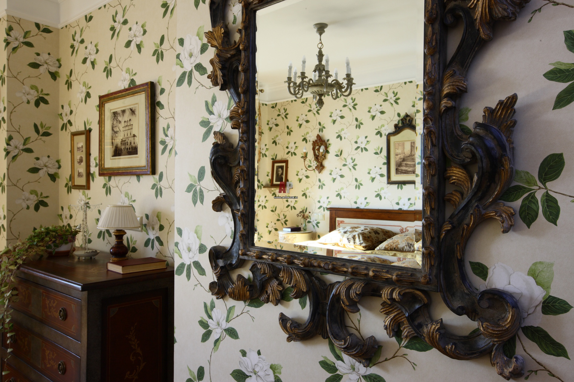 Интерьер спальни с цветочным декором. Зеркало в резной раме в духе старой Италии.