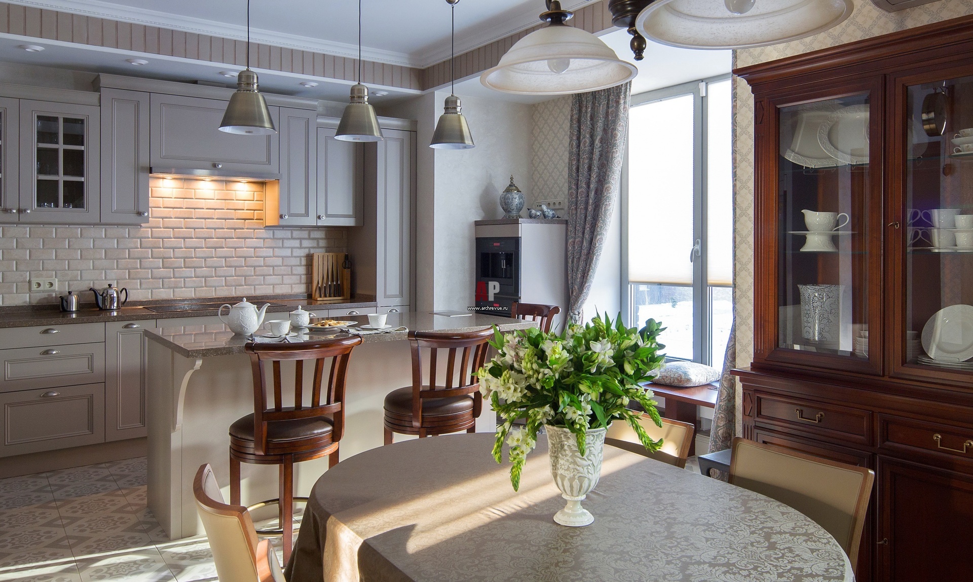 Интерьер кухни-столовой цвета тортора в неоклассическом таунхаусе. Зона кухни выделена напольной плиткой с декоративным орнаментом, Porcelanosa.