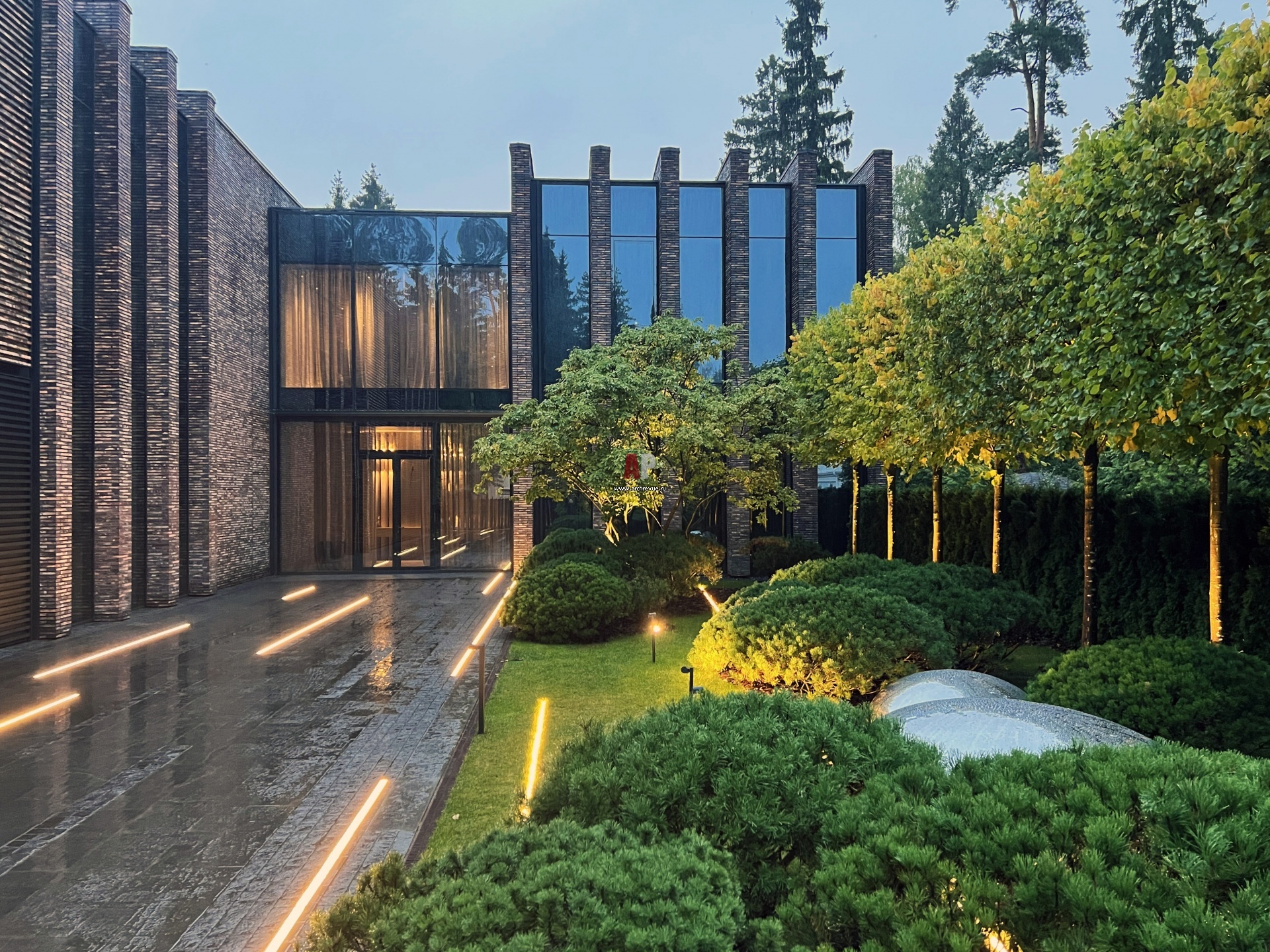 Передняя часть участка – въездная группа. Мощение – серый гранит, в него интегрированы светодиодные линейные светильники, подчеркивающие современную лаконичную архитектуру дома.