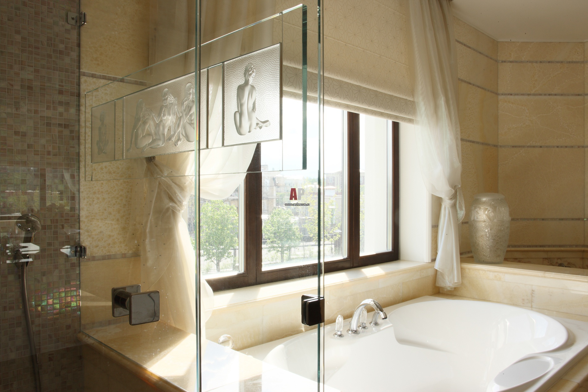 Фото интерьера женской ванной комнаты в стиле ар-деко. Светлый оникс на стенах, перламутровая мозаика, белые драпировки – все это работает на создание нежного, женственного интерьера. Драгоценностью на прозрачном стекле душевой кабины смотрятся три выгравированные декоративные вставки от Lalique с изображением женских фигур.