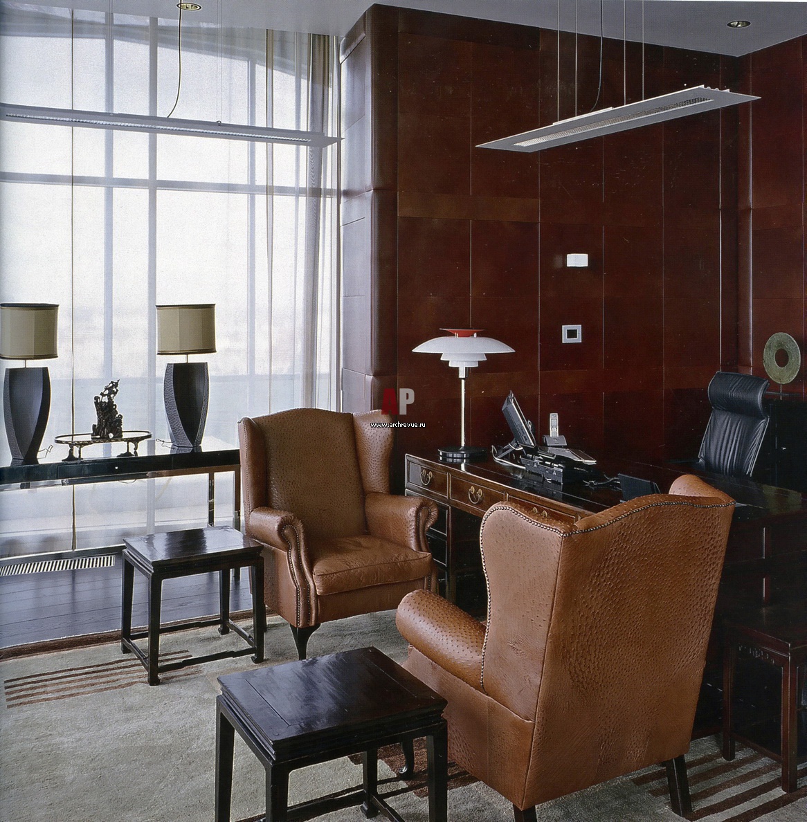 Фото интерьера кабинета руководителя. Интерьер кабинета одного из руководителей формируют лаковой этнический стол и внушительные кресла из страусиной кожи.