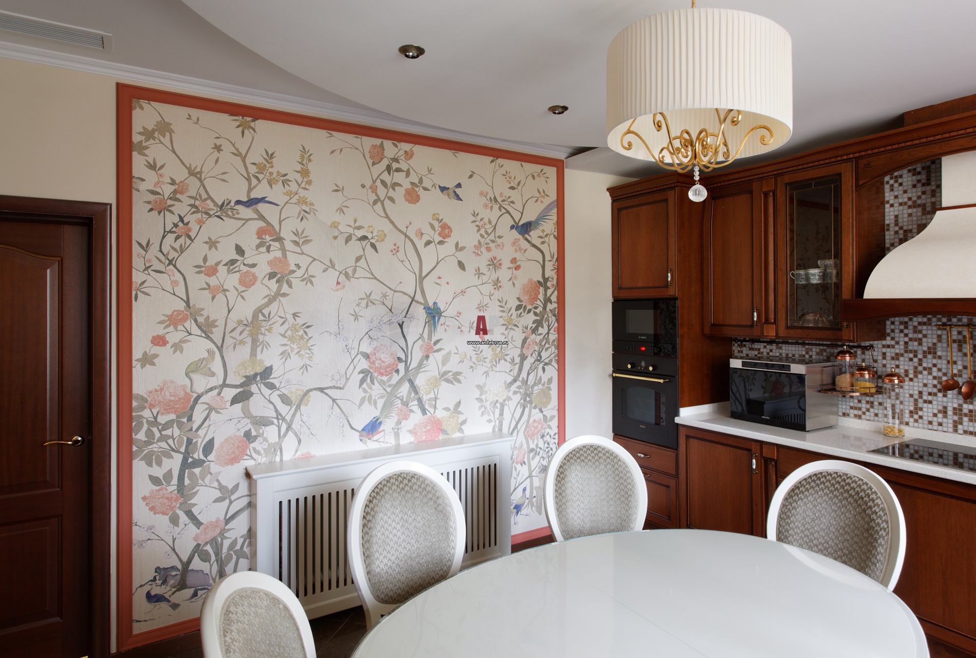 Акцент кухни – настенное панно в винтажном стиле. Оно набрано из нескольких бумажных полотен, поставщик «Ампир Декор». Пионы, изображенные на панно, повторяются в вышивках на шторах. Кухня была куплена хозяевами.