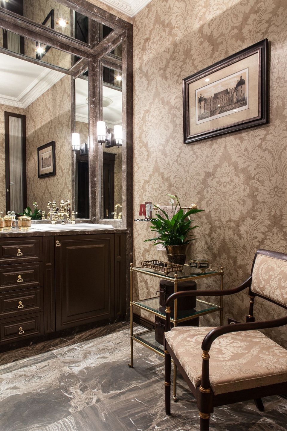 Дизайн интерьера ванной комнаты при хозяйской спальне в стиле современной классики. Стены оформлены текстильными обоями с рисунком «дамаск», они покрыты специальным влагостойким покрытием. На полу – мраморная плитка.