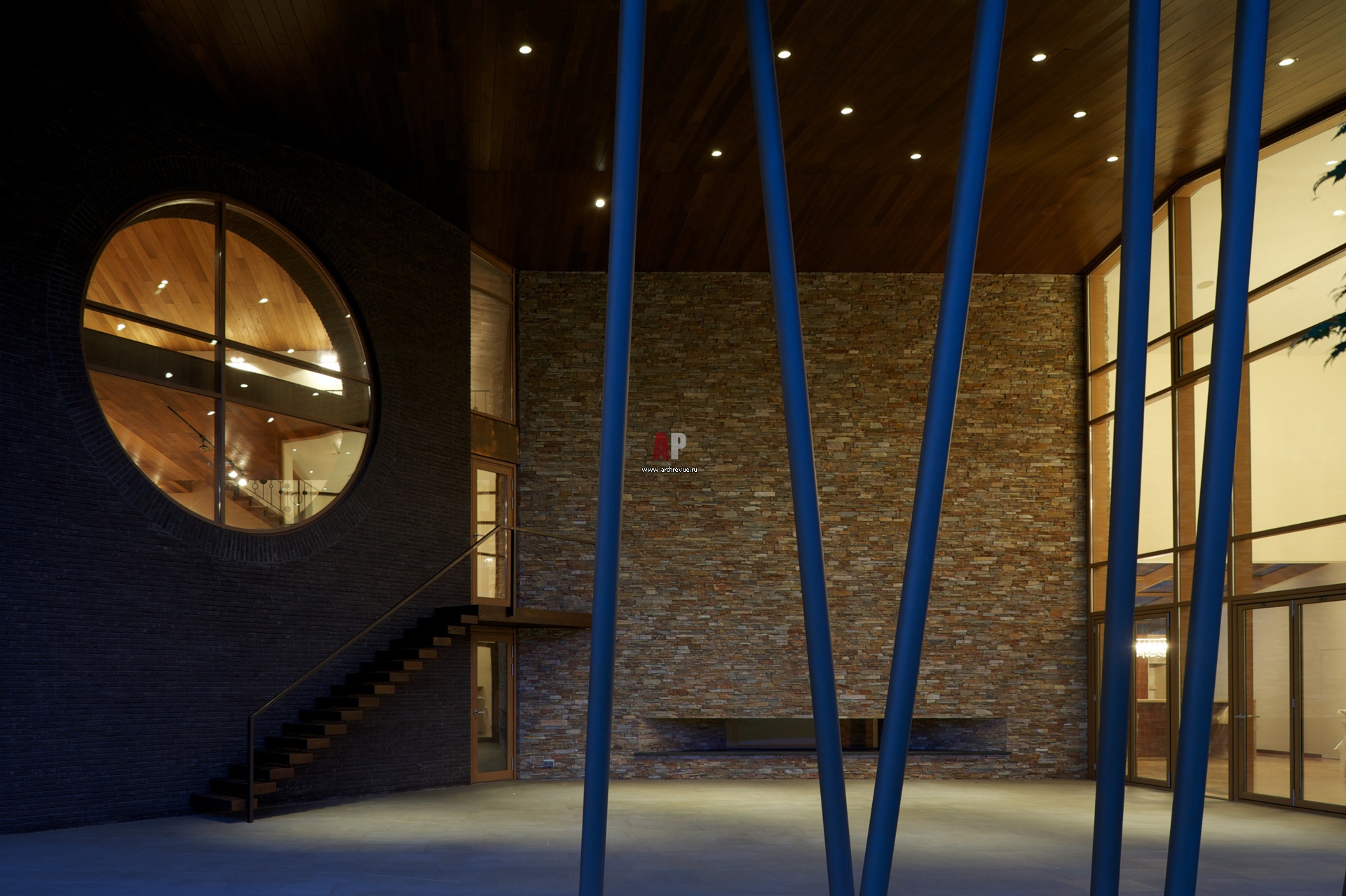 Ночной фасад. На фасаде – стеклянная перегородка высотой 7 метров. Закаленное стекло (8 мм) в массе тонированное под бронзу. Потолок проема имеет наклон, повторяющий форму крыши, верхнее стекло перегородки и рама перегородки имеют сложную форму.