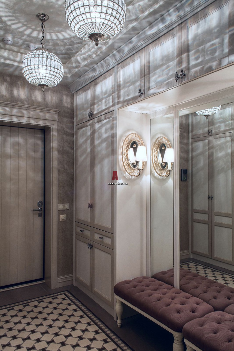 Фото интерьера прихожей в стиле фьюжн. Игру света и теней на потолке и стенах создают светильники-шары Eichholtz.