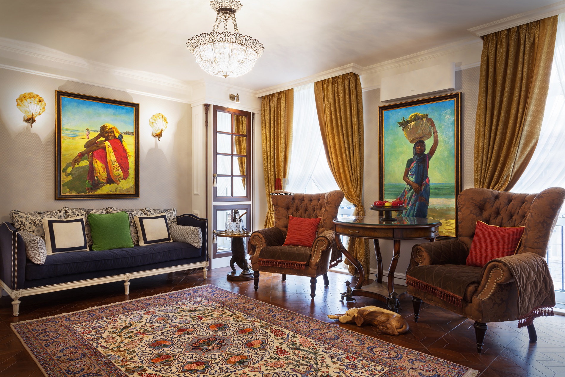 Яркая колористика интерьера гостиной определяется неоклассической мебелью с насыщенной сапфировой обивкой, коврами ручной работы, а также полотнами художника Михаила Рудника из марокканской серии.
