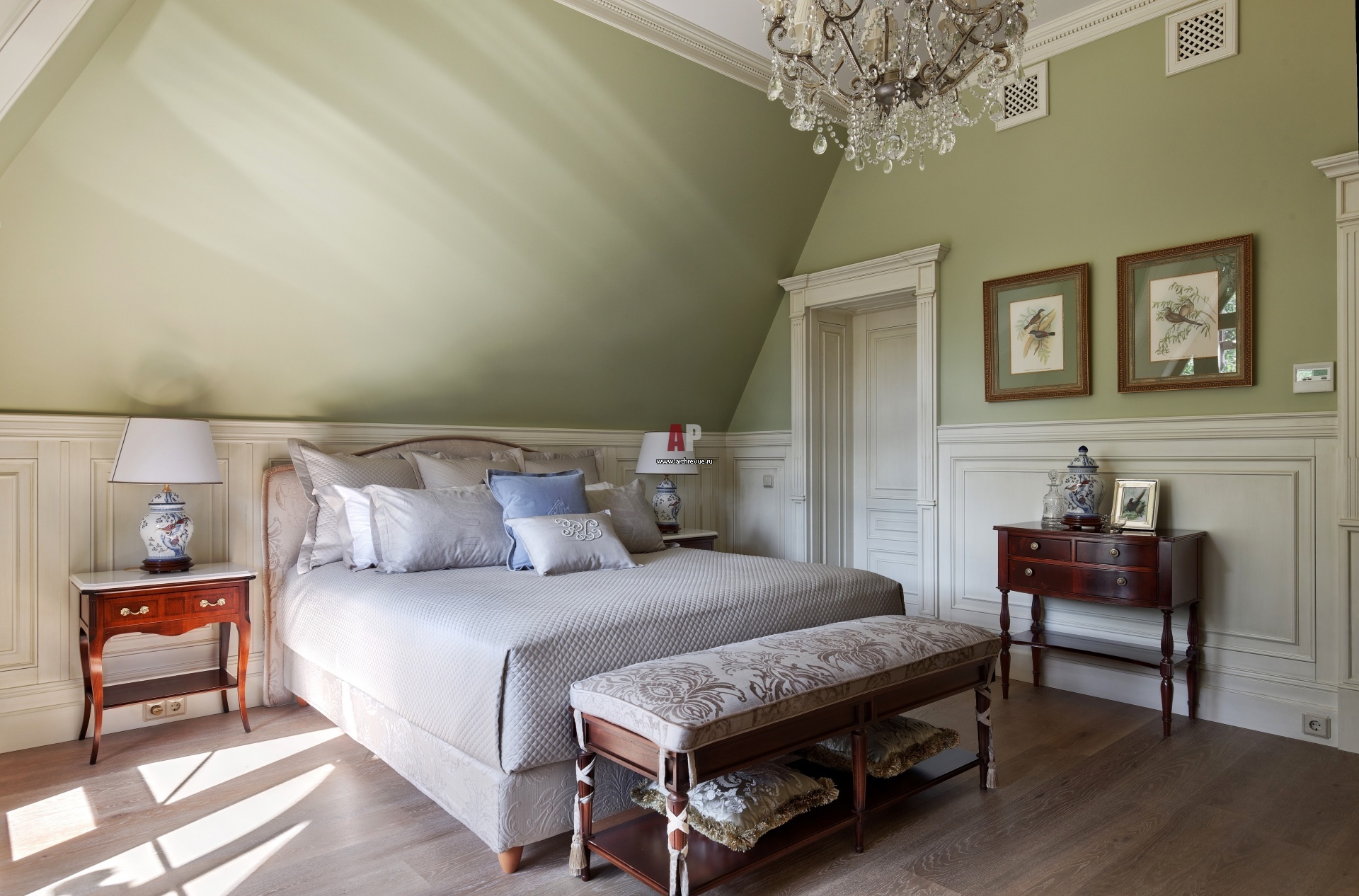 Помимо зоны отдыха с бильярдом в мансарде третьего этажа находятся две гостевые спальни. Они выполнены в стиле облегченной классики. Паркетная доска Karelia, дуб Stonewashed, поставщик «Мир Паркета».