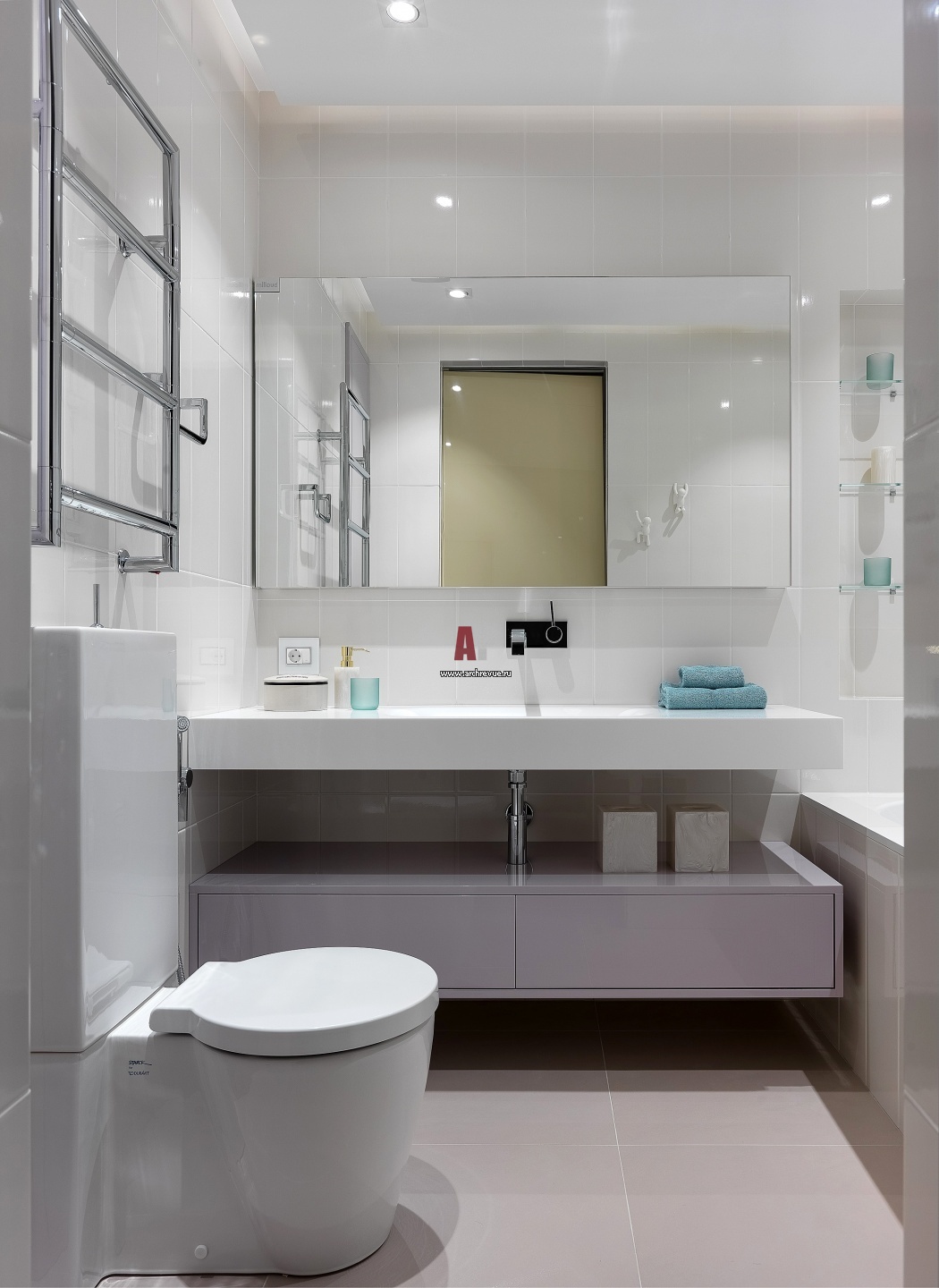 Основной санузел. Стены облицованы светлой плиткой Villeroy & Boch. На полу – керамогранит, Atlas Concorde, коллекция Evolve. Умывальник серо-лилового цвета сделан на заказ, фасады глянцевые. Раковина, Milldue. Унитаз, Duravit.