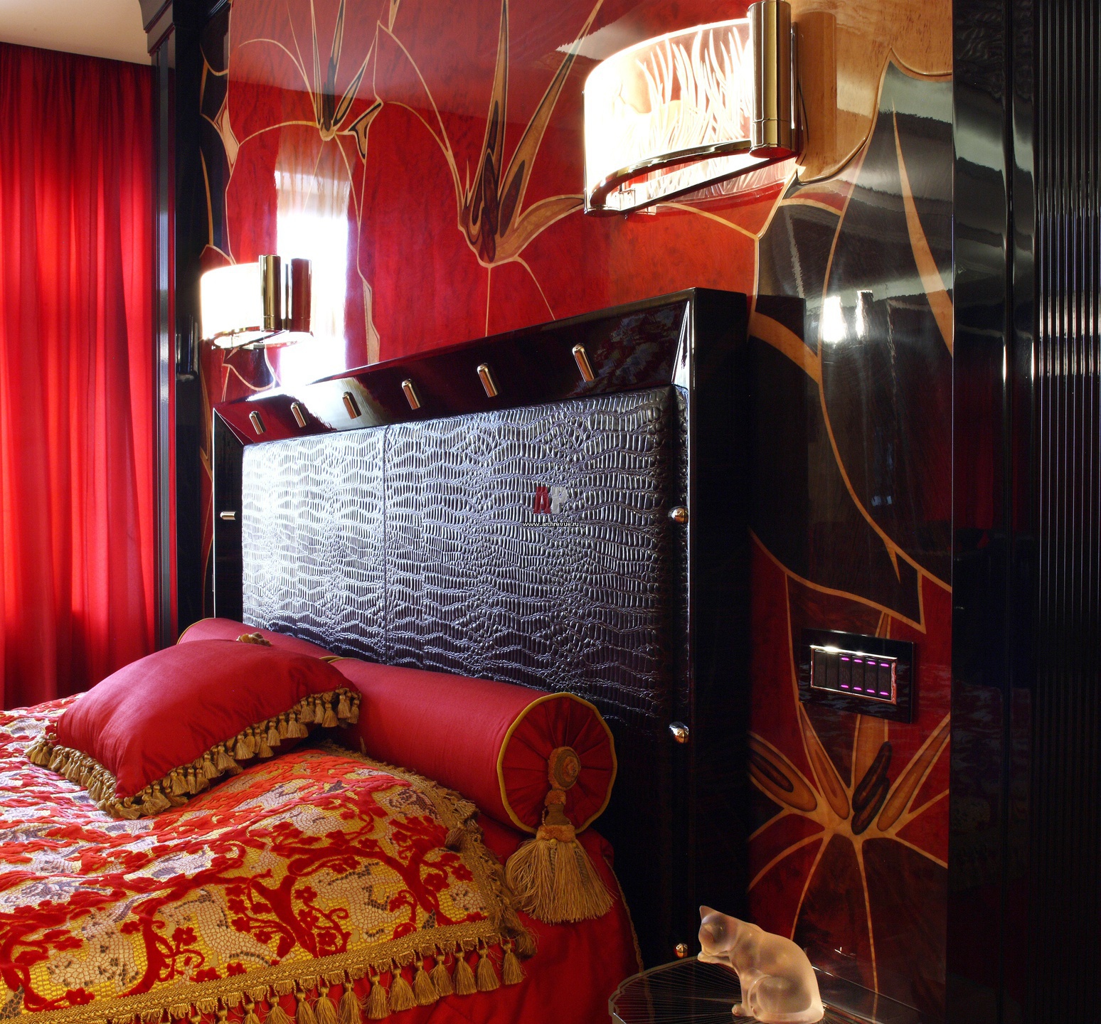 Украшение мужской спальни – большое панно у изголовья кровати. Оно выполнено в технике маркетри из шпона разных пород дерева. Для большей живописности поверх пластин шпона были дорисованы линии и тени. Уникальность панно – в его большом размере.