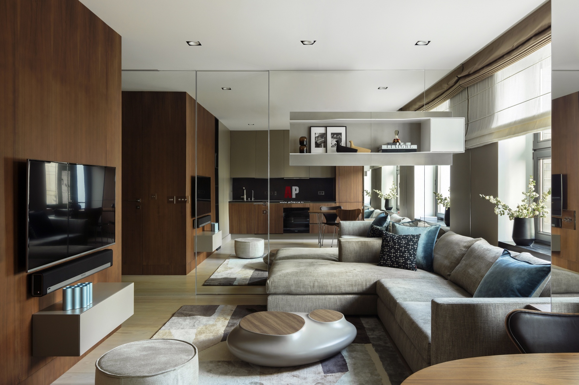 Интерьер квартиры выполнен в стиле минимализм. Стены оформлены панелями из американского ореха и зеркалами. На фоне зеркальных панелей растворяется лаконичная дверь Bluinterni, также отделанная зеркалами. Диван, Flexform. Журнальный столик, Roche Bobois, модель Cute Cut.