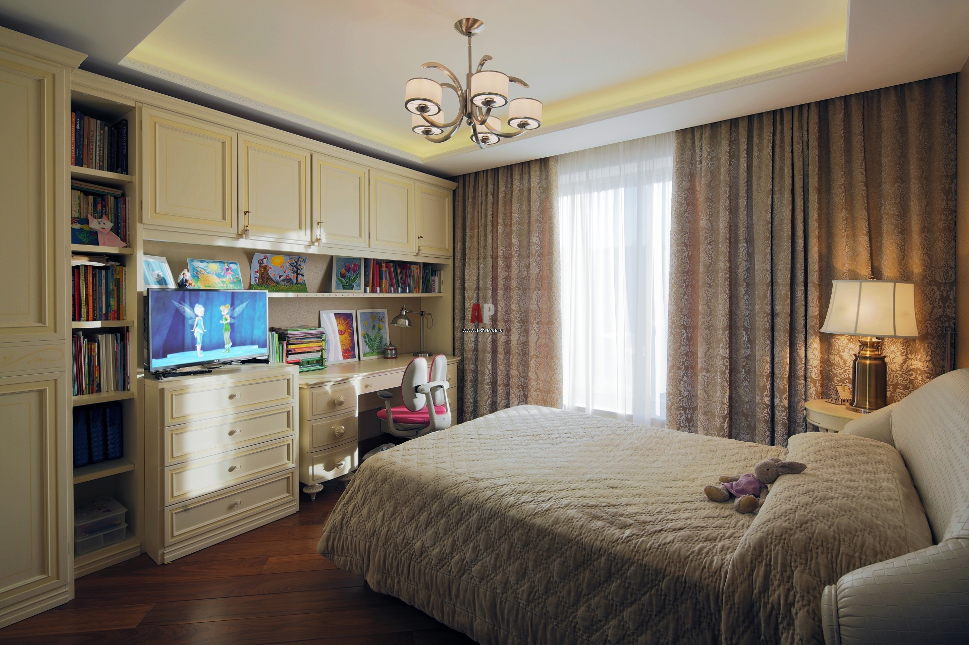 Комната второй дочери. Спальни обеих дочерей решены в сходной стилистке, но в разной колористике: сиреневой и золотисто-бежевой. На полу – инженерная доска, американский орех, поставщик «Мир Паркета».