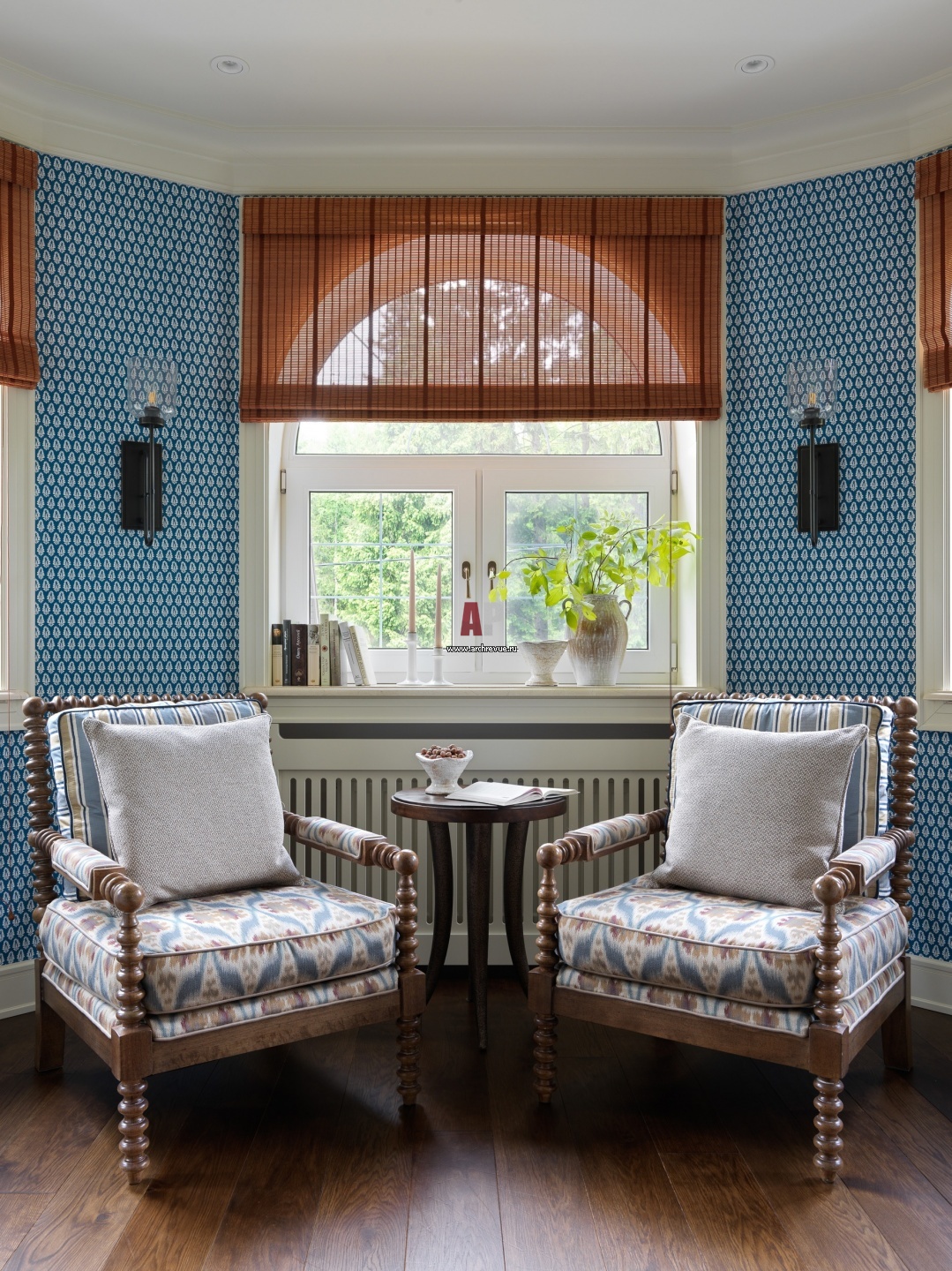 Чайная комната на втором этаже, она же полукруглая библиотека. Обои, York Wallcoverings. Кресла, Universal Explore Home в ткани Kravet Couture. Столик, Uttermost. Бра, Robert Abbey.