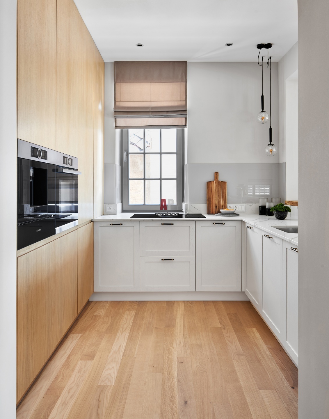 Кухня создана по эскизу дизайнера. Столешница выполнена из кварцита. Варочная панель со встроенной вытяжкой, Elica. Техника, Bosch. Светильники, Nuura.