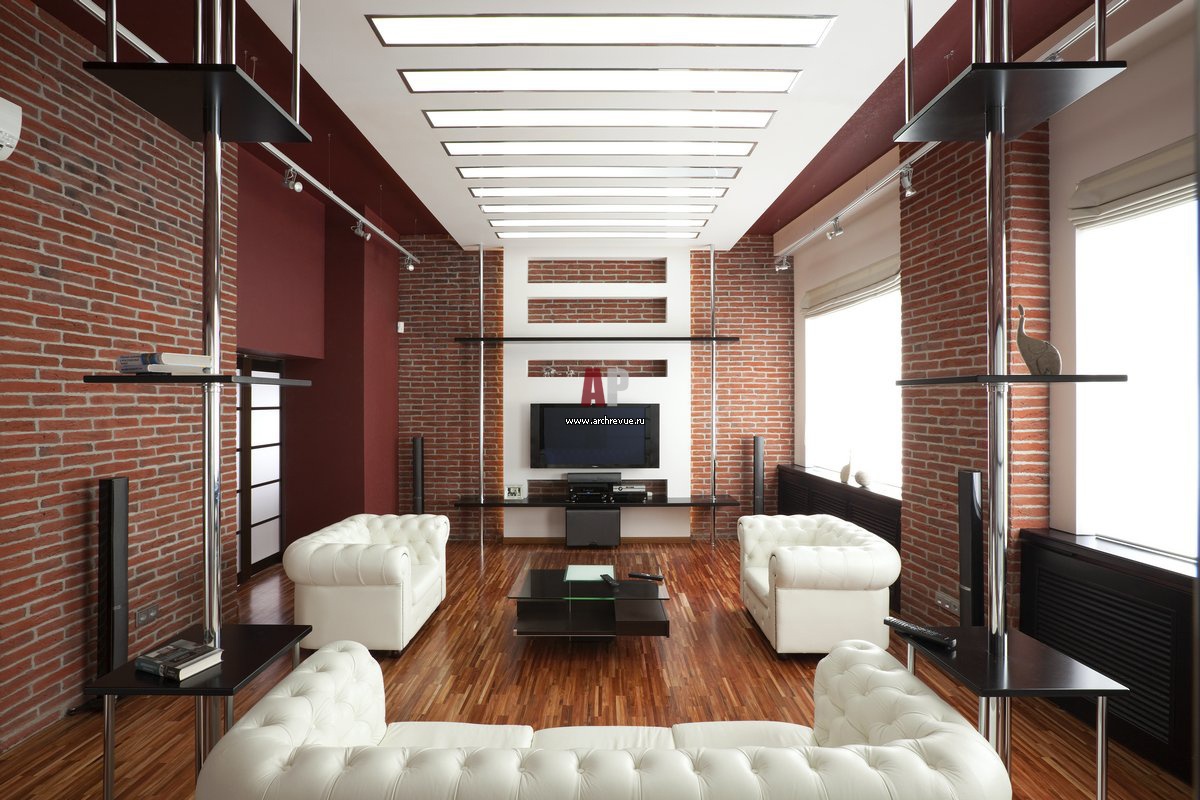 Гостиная кажется необычайно просторной за счет больших окон и высоких потолков. Потолок представляет собой чередование гипсокартонных плоскостей и полос плексигласа со скрытой подсветкой. Стены гостиной оформлены фасадным кирпичом, поставщик «Джиель».