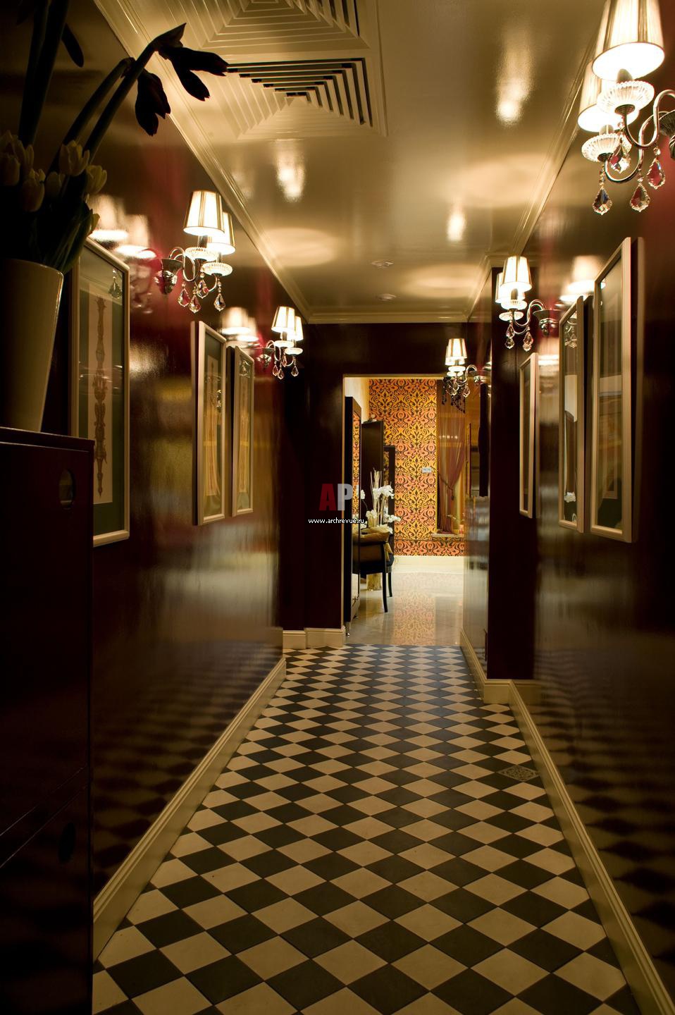 Холл выглядит торжественно благодаря черно-белой плитке на полах, бордовым стенам, картинам в рамах и небольших брас абажурами.
