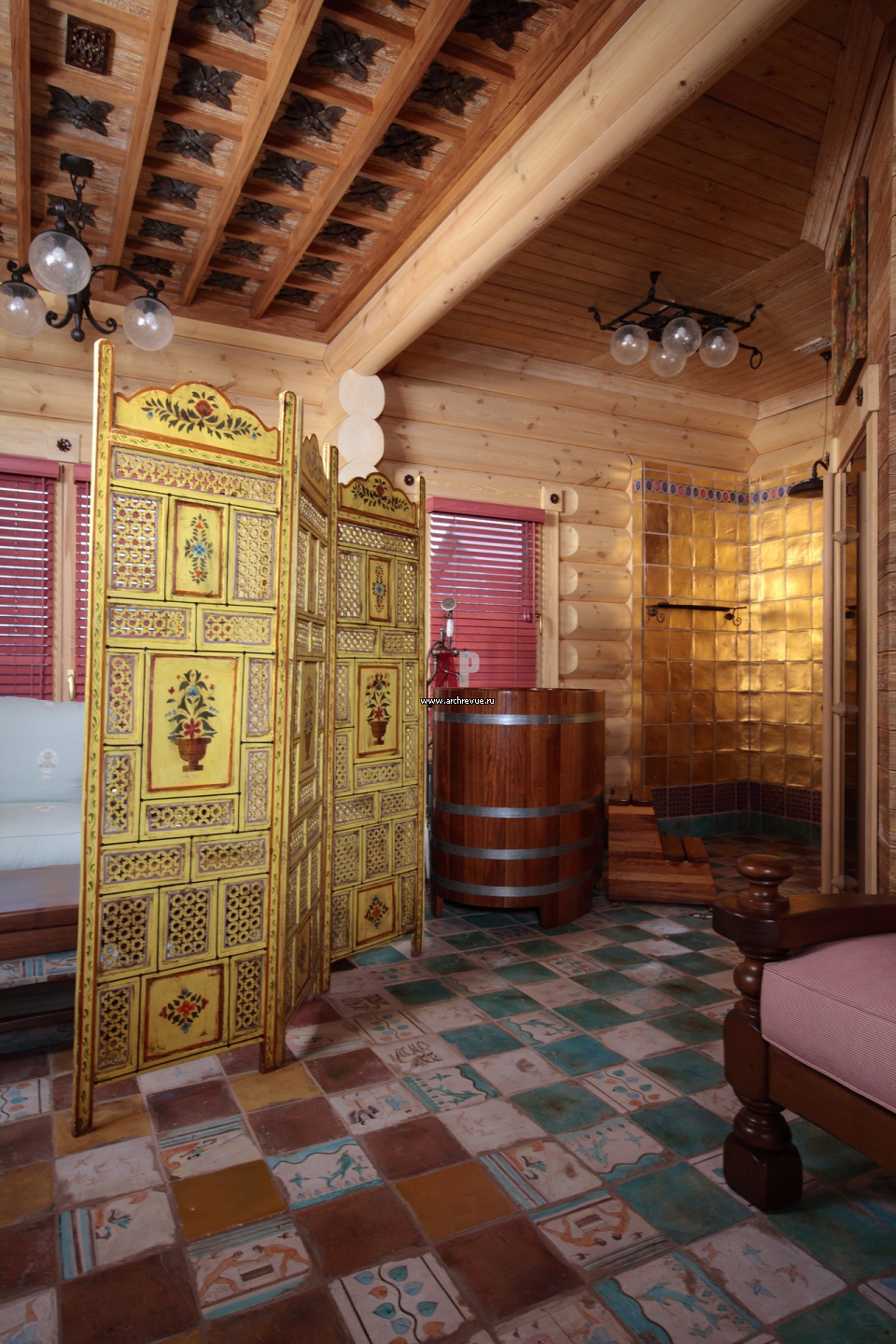 Дизайн открытой душевой в банном комплексе с золотистой расписной ширмой. Стены в душевой покрыты сусальным золотом. Кессонные потолки из состаренного дерева.