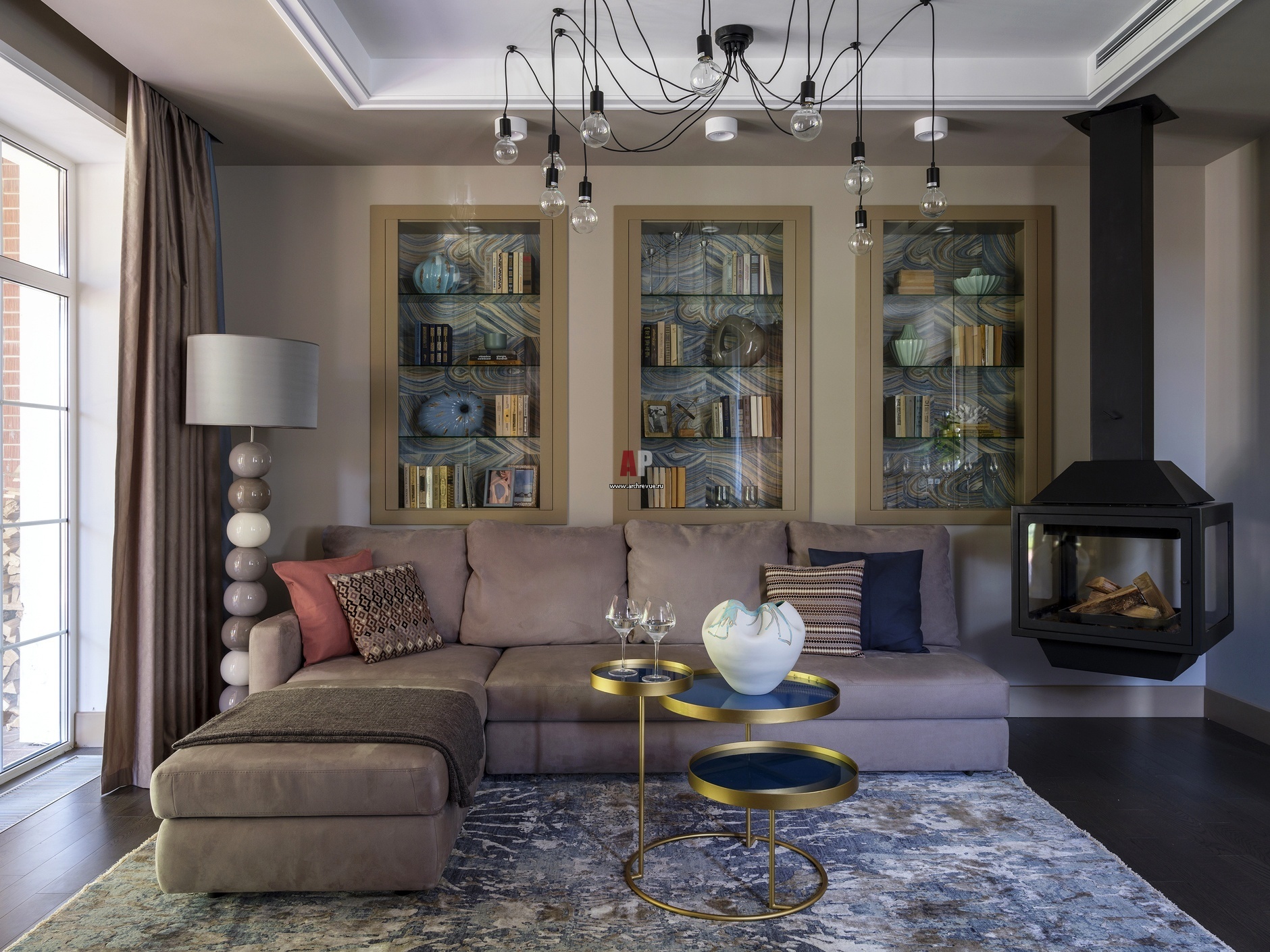 Диванная группа с подвесным камином в гостиной акцентирована тремя нишами, в которых размещена библиотека. Задняя стенка шкафов оклеена обоями с рисунком спила полудрагоценного камня. Обои, York Wallcoverings, серия Candice Olsen.