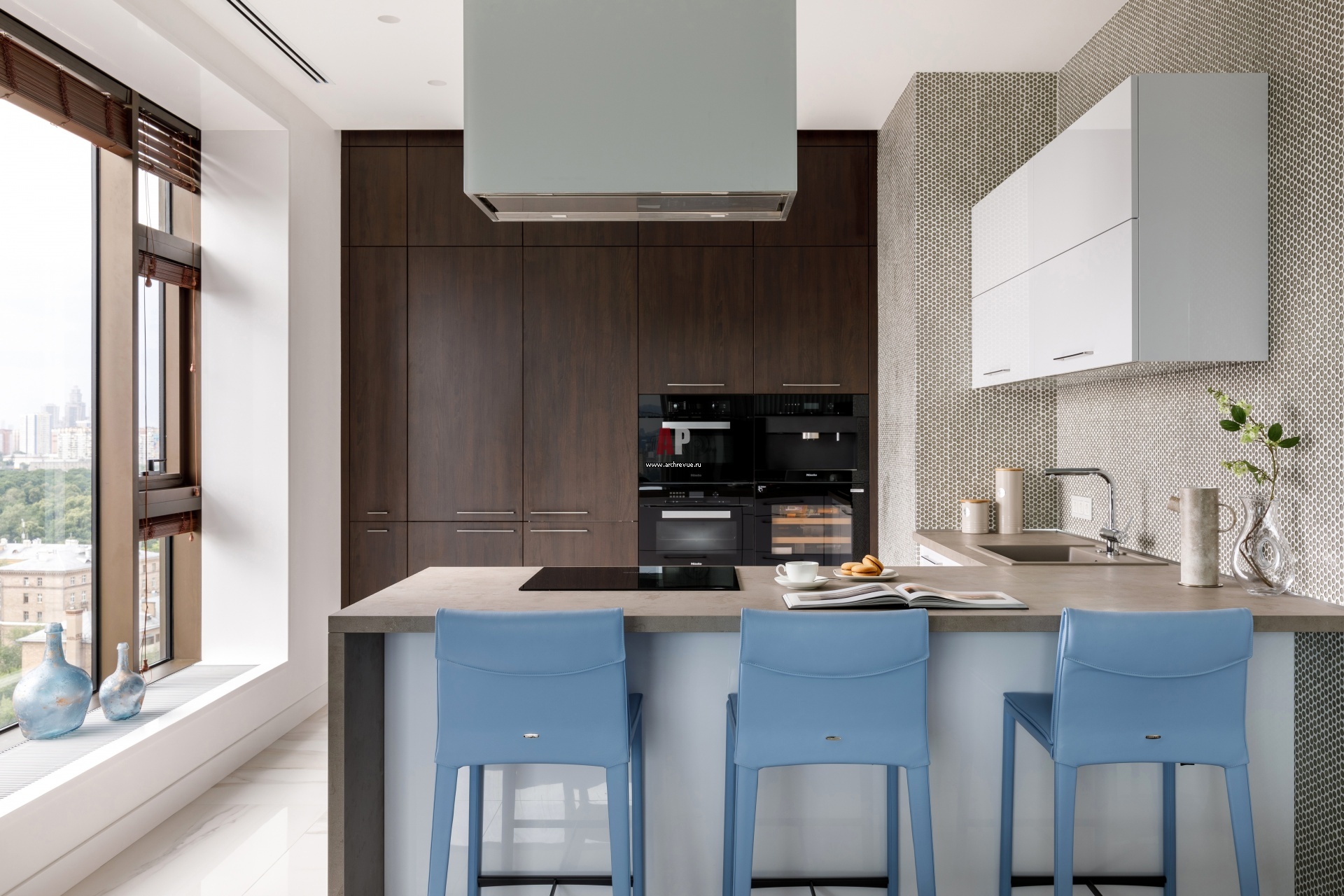 Одно из пожеланий заказчиков – функциональная кухня с островом. Фасады кухни Schmidt в двух видах отделки: экзотическим деревом и белым глянцем. Полубарные стулья, Cattelan Italia, модель Isabel, отделка – кожа разбеленного цвета blue electric.