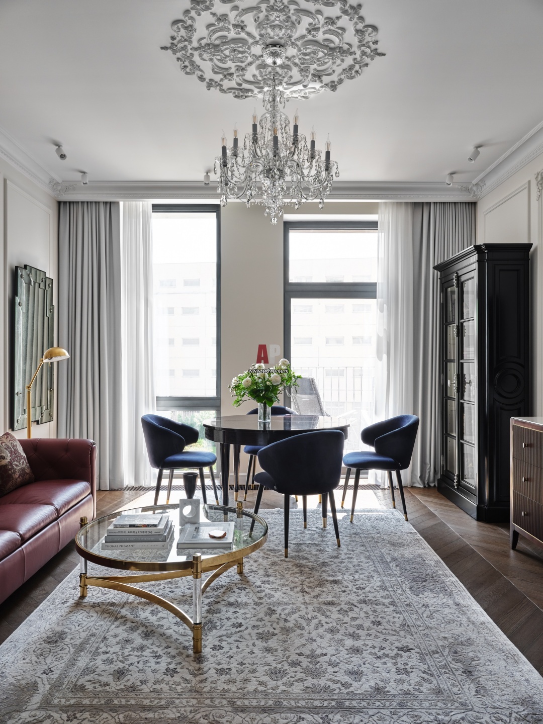 В гостиной есть диванная группа и столовая зона. Общая площадь помещения – 21,7 кв. м. Карнизы, молдинги, потолочная розетка выполнены в классическом стиле из гипса.