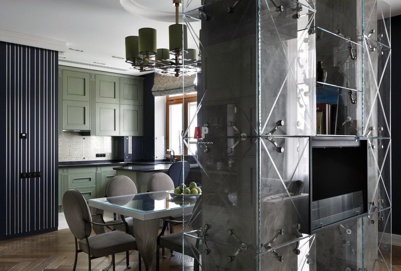 Несущую колонну архитекторы обыграли как перегородку. Они достроили еще одну и оформили конструкцию по принципу вентилируемых фасадов стеклянными панелями на металлических кронштейнах, что внесло в интерьер индустриальную ноту.