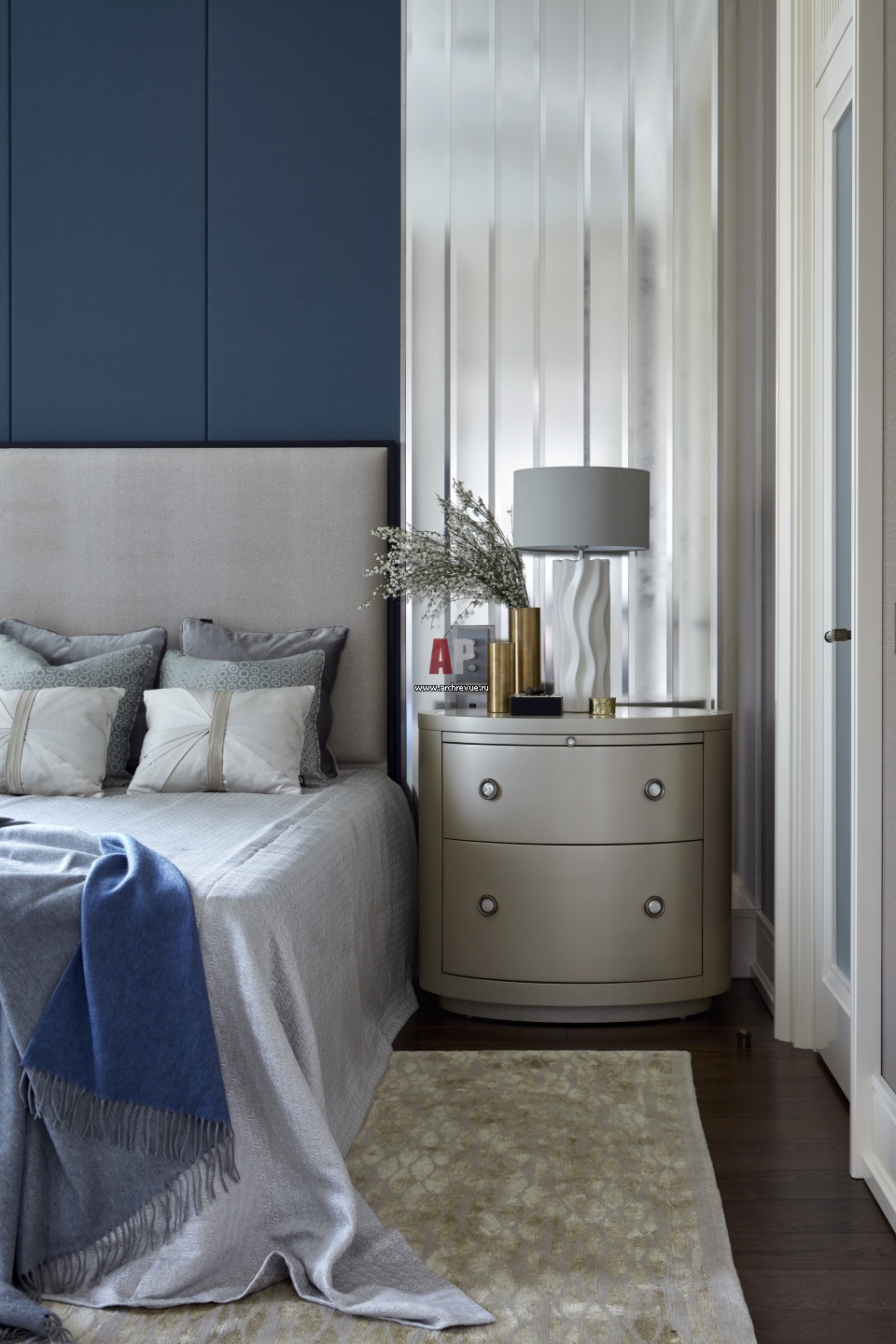 Фото спальни в стиле ар-деко. Прикроватная тумба, Caracole. Настольная лампа, Heathfield & Co. Стена за изголовьем кровати обита синей тканью.