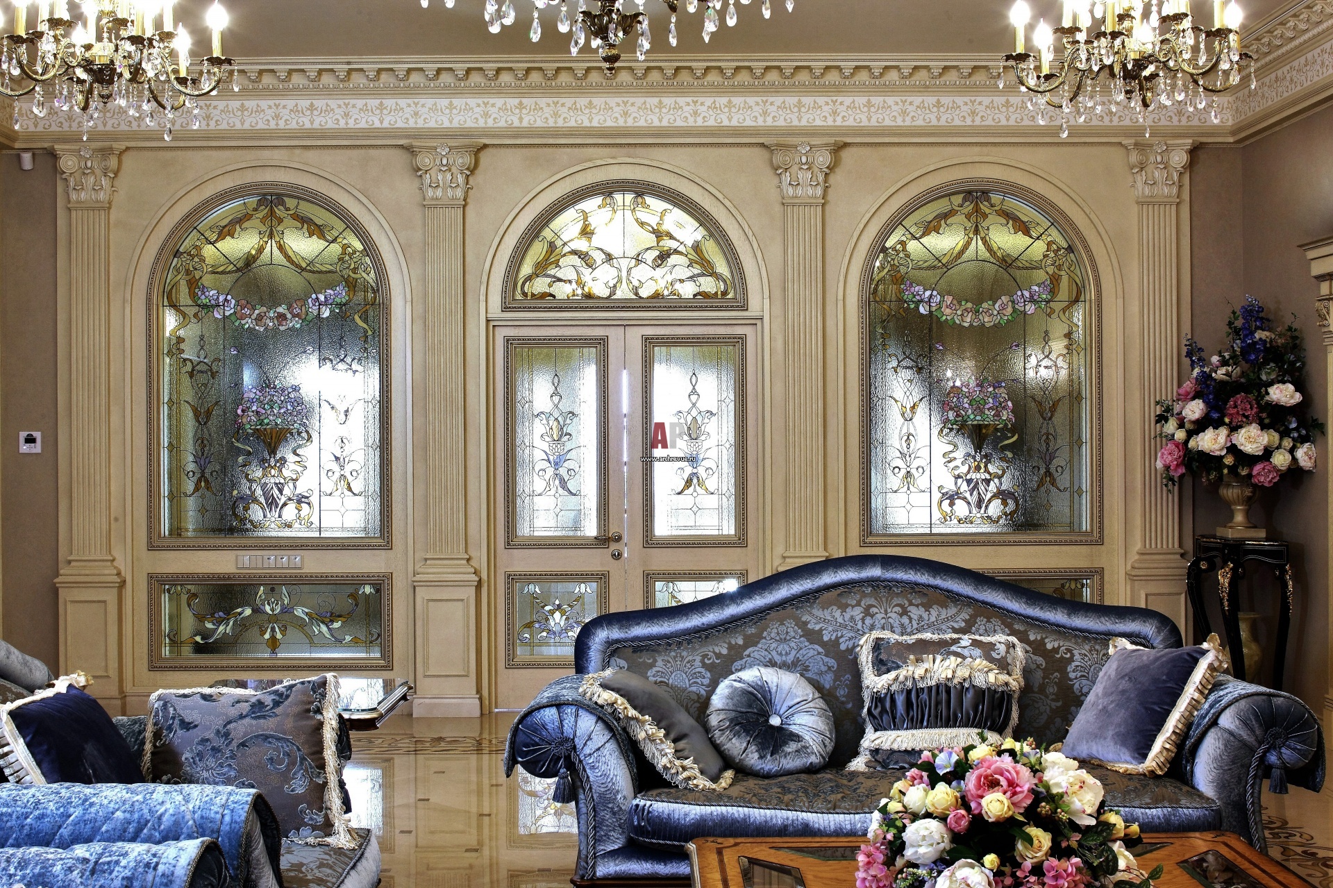 От прихожей гостиную отделяют распашные двери. Они, как и вся стена, декорированы витражами по авторским эскизам с сюжетом в духе рококо с цветочными гирляндами и вазами. Диваны, журнальный столик, Jumbo.