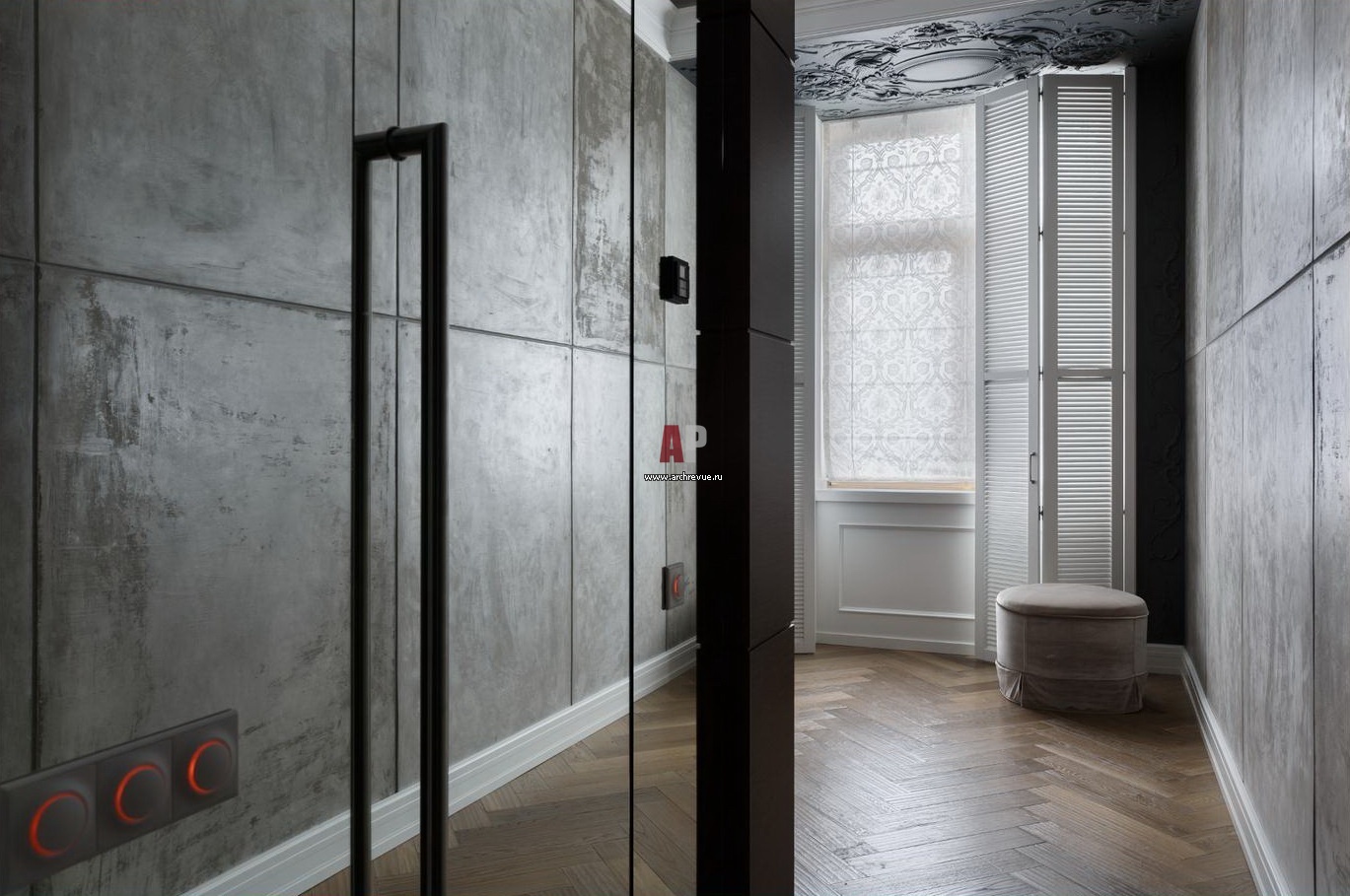 Интерьер гардеробной. Стены оформлены панелями из архитектурного фибробетона.