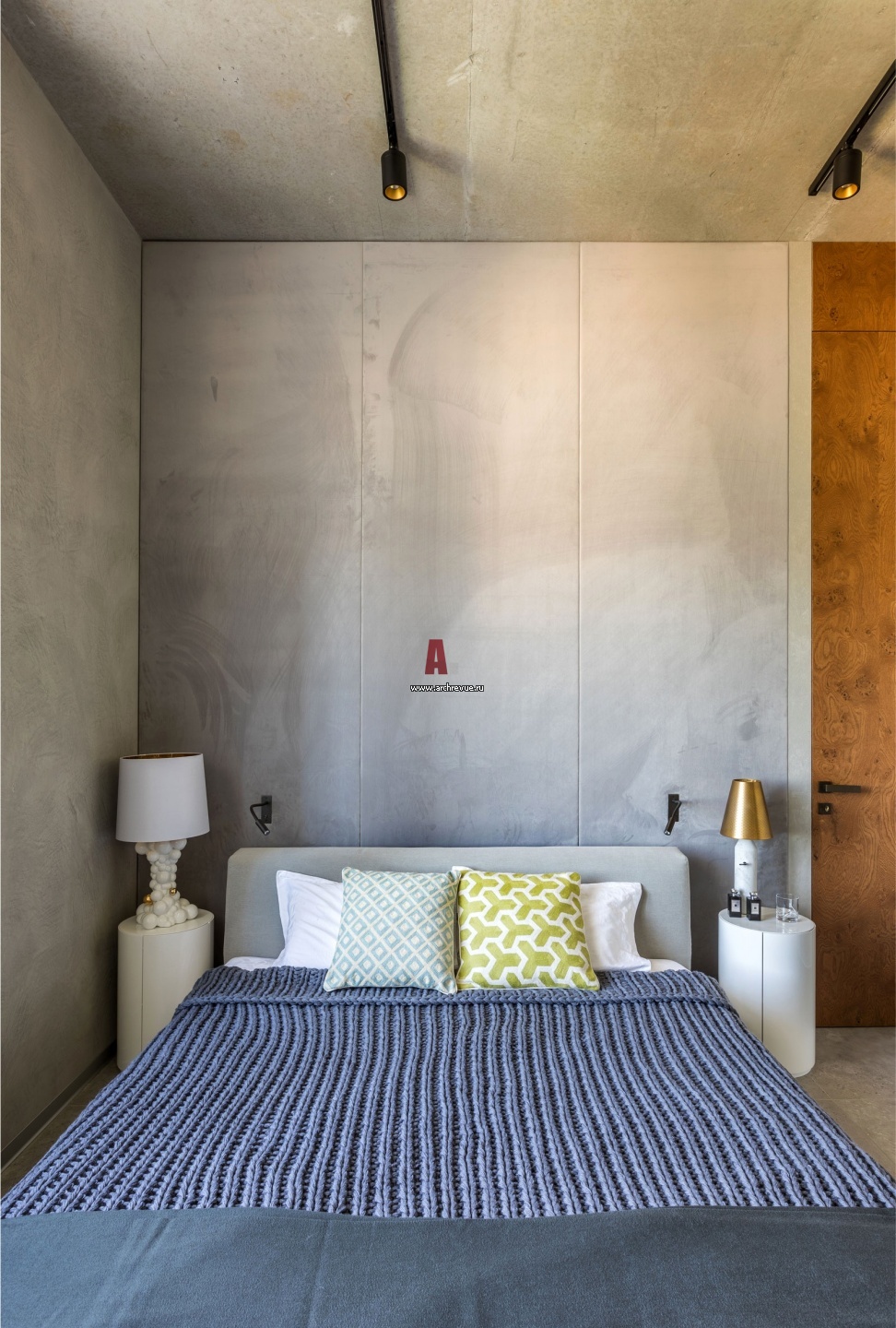 Интерьер спальни в минималистской мужской квартире. Кровать и прикроватные тумбочки, Meridiani. Настольные лампы, Bosa и La Chance. Стена за изголовьем отделана мягкими панелями из алькантары того же цвета, что и бетонные стены.