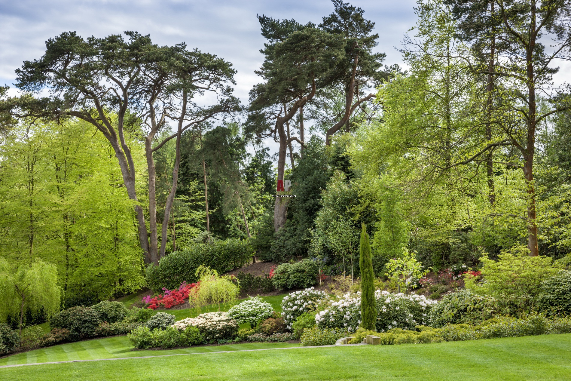 Группы белых, розовых и сиреневых рододендронов передают друг другу «эстафету» цветения. Использование вечнозеленых хвойных и лиственных растений наполняет сад свежими зелеными красками круглый год. В их числе: рододендроны, самшиты, калина давида, калина гибридная «Прагенсе», пиерис японский и лавровишня.