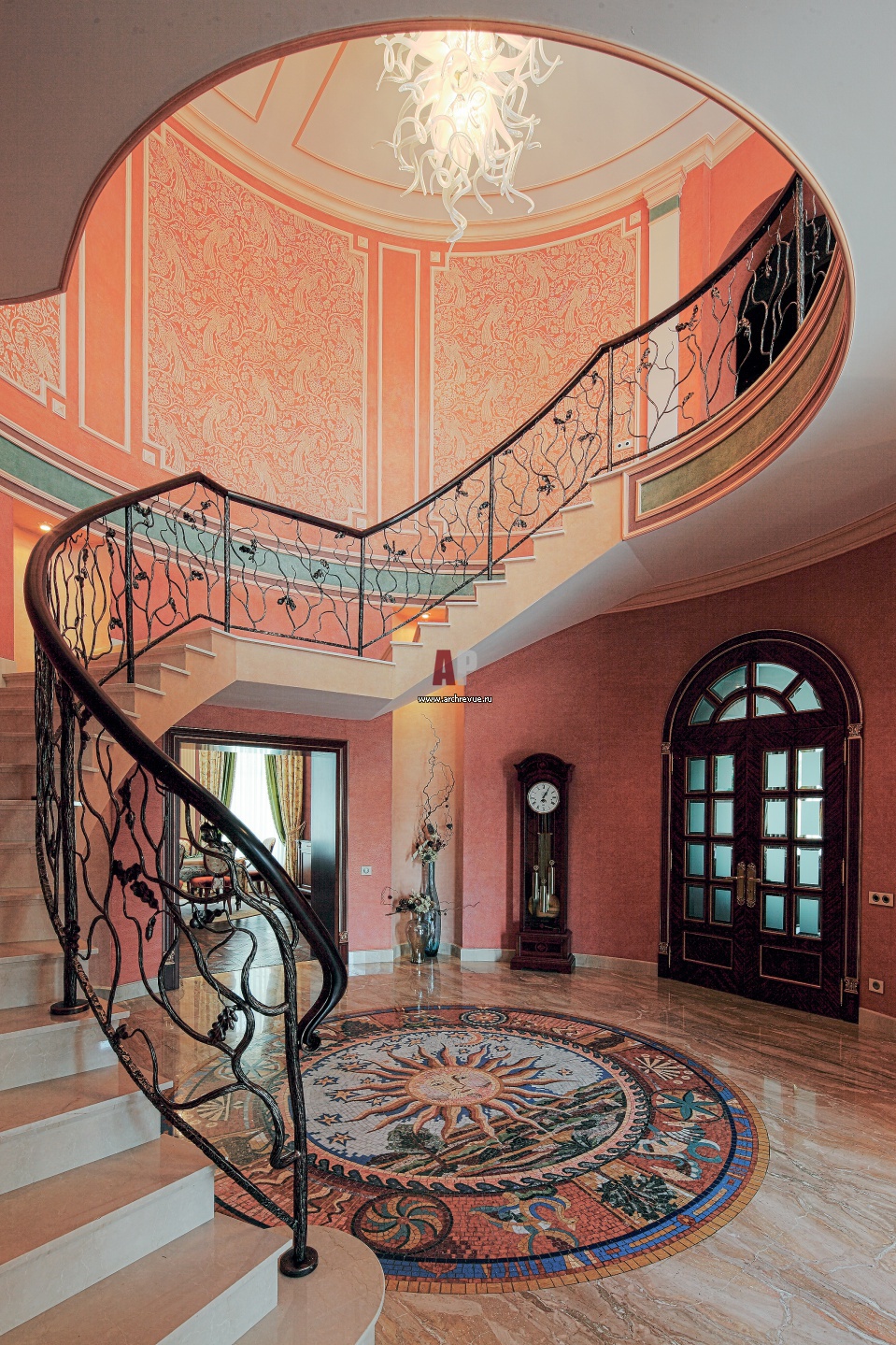 Центральный холл с винтовой лестницей украшен мозаичным напольным панно в духе древнеславянской живописи. Солнечным лучам мозаики вторит форма современного итальянского светильника. Перила в виде сплетенных веток деревьев выполнены из кованого металла с патиной.
