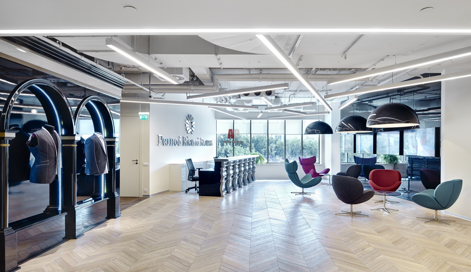 Интерьер входной группы решен просто и функционально. Фигурная рецепция с латунными накладками оформлена как барная стойка.