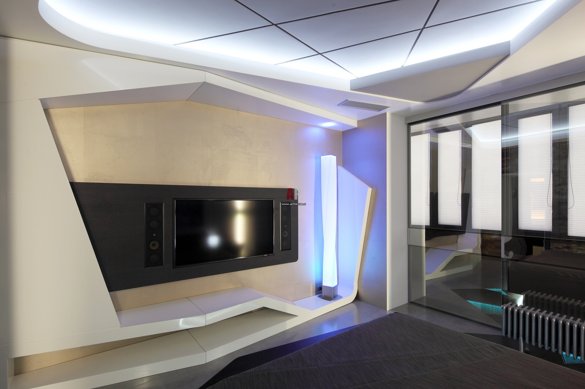 Из двух балконов архитектор выстроил галерею, которая связала гостиную со спальней. Вход в спальню отделен стеклянными солнцезащитными раздвижными дверьми от пола до потолка.