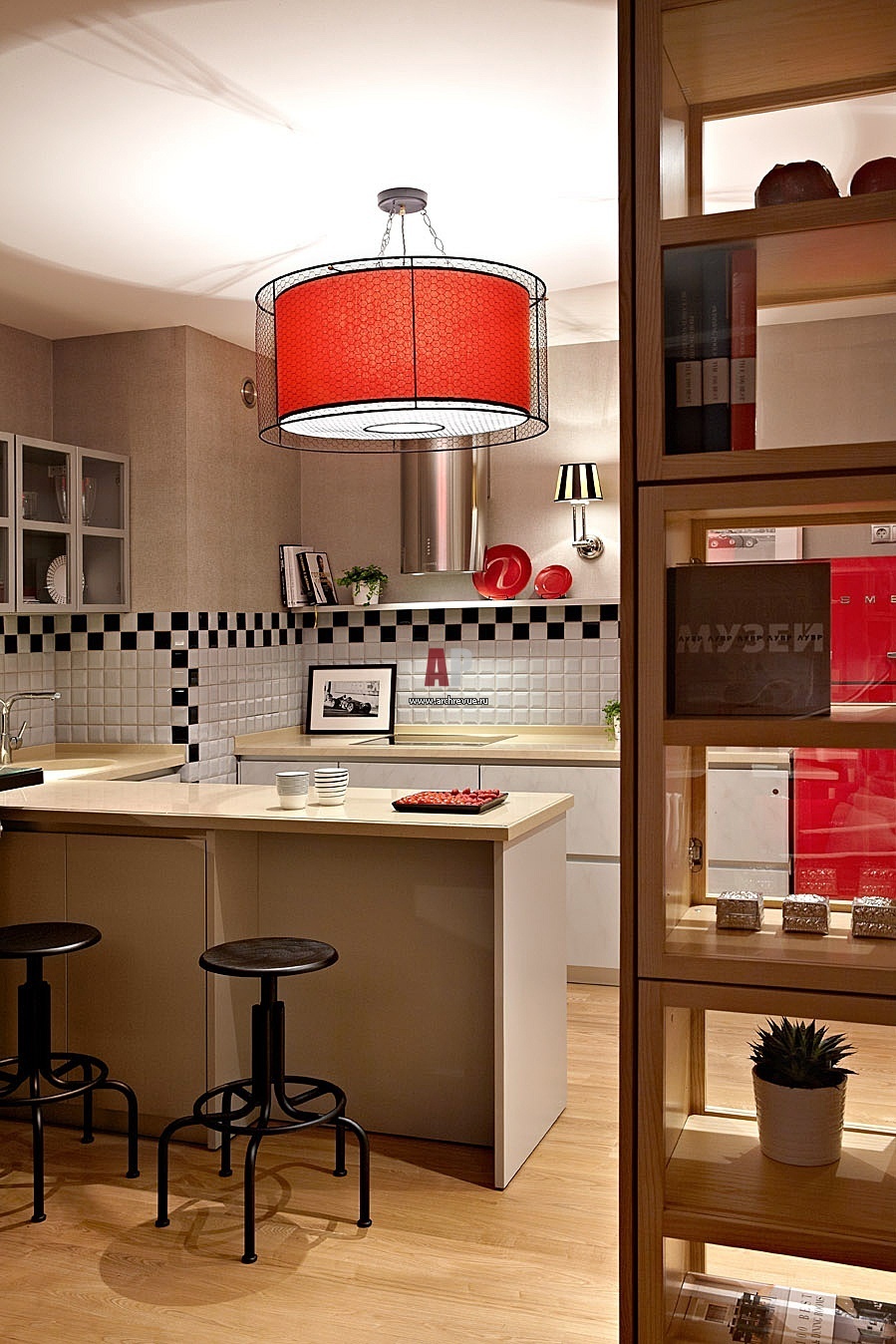 Вид из гостиной на кухню через сетчатый стеллаж.